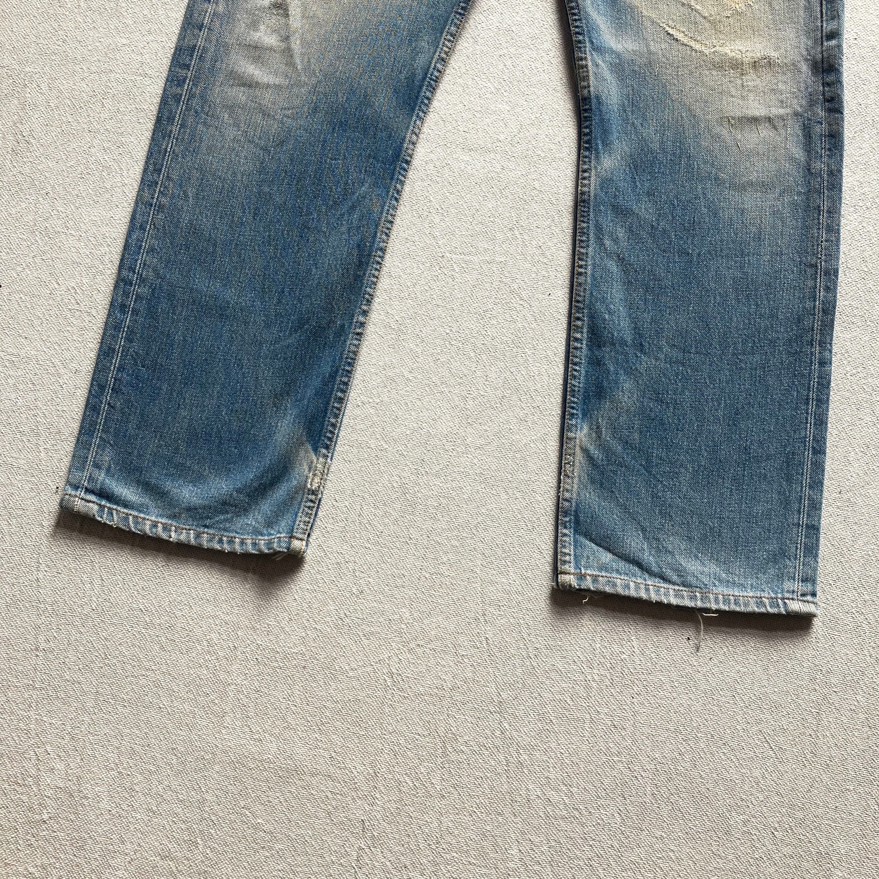 太もも部分のダーニング処理、裾の擦り切れダメージなど、全体的に非常に雰囲気のある一本となっております。sizeもW33 L32の適度にゆとりあるシルエットをしておりますので、ジャスト・オーバーどちらのサイズ感のトップスにもうまく対応してくれるかと思います。