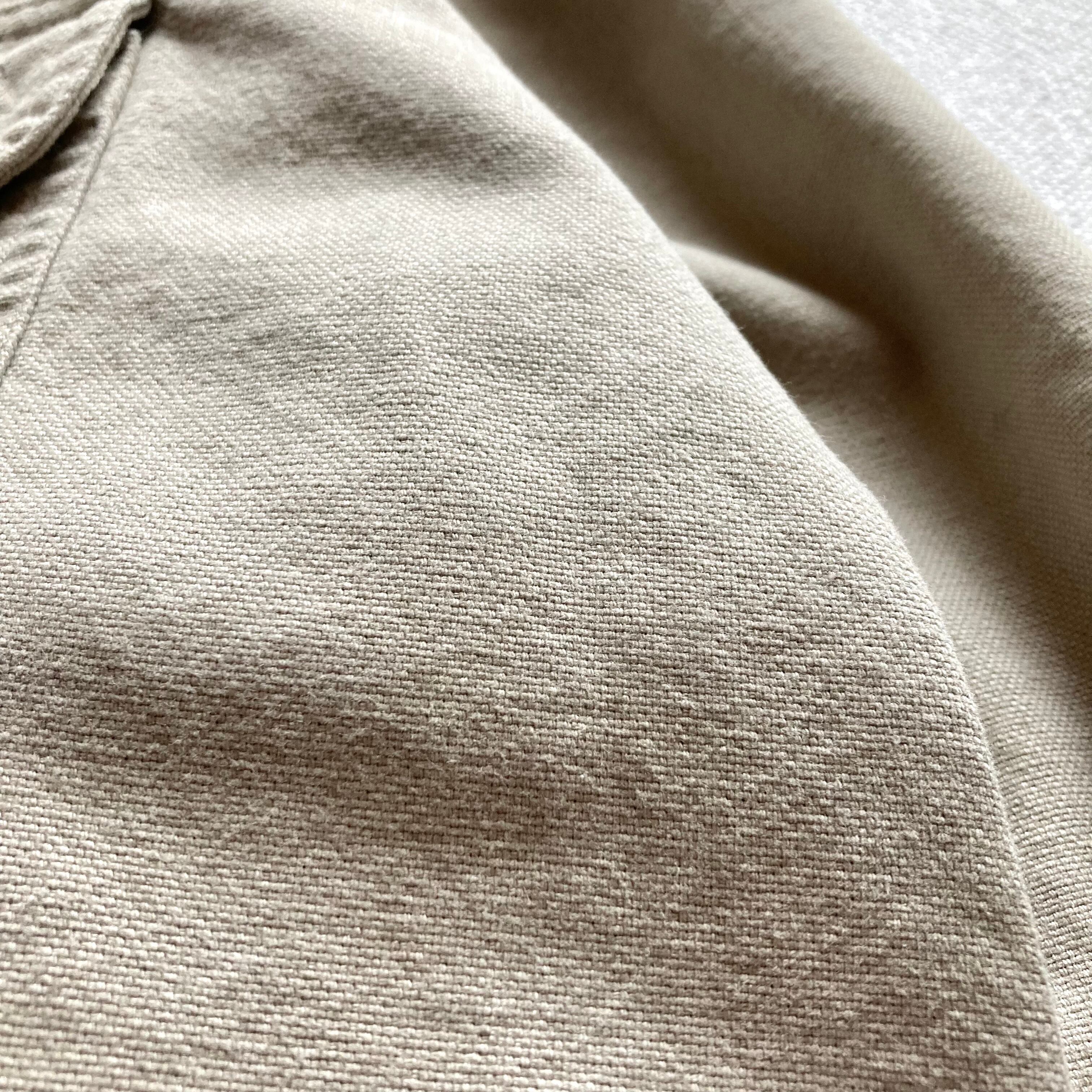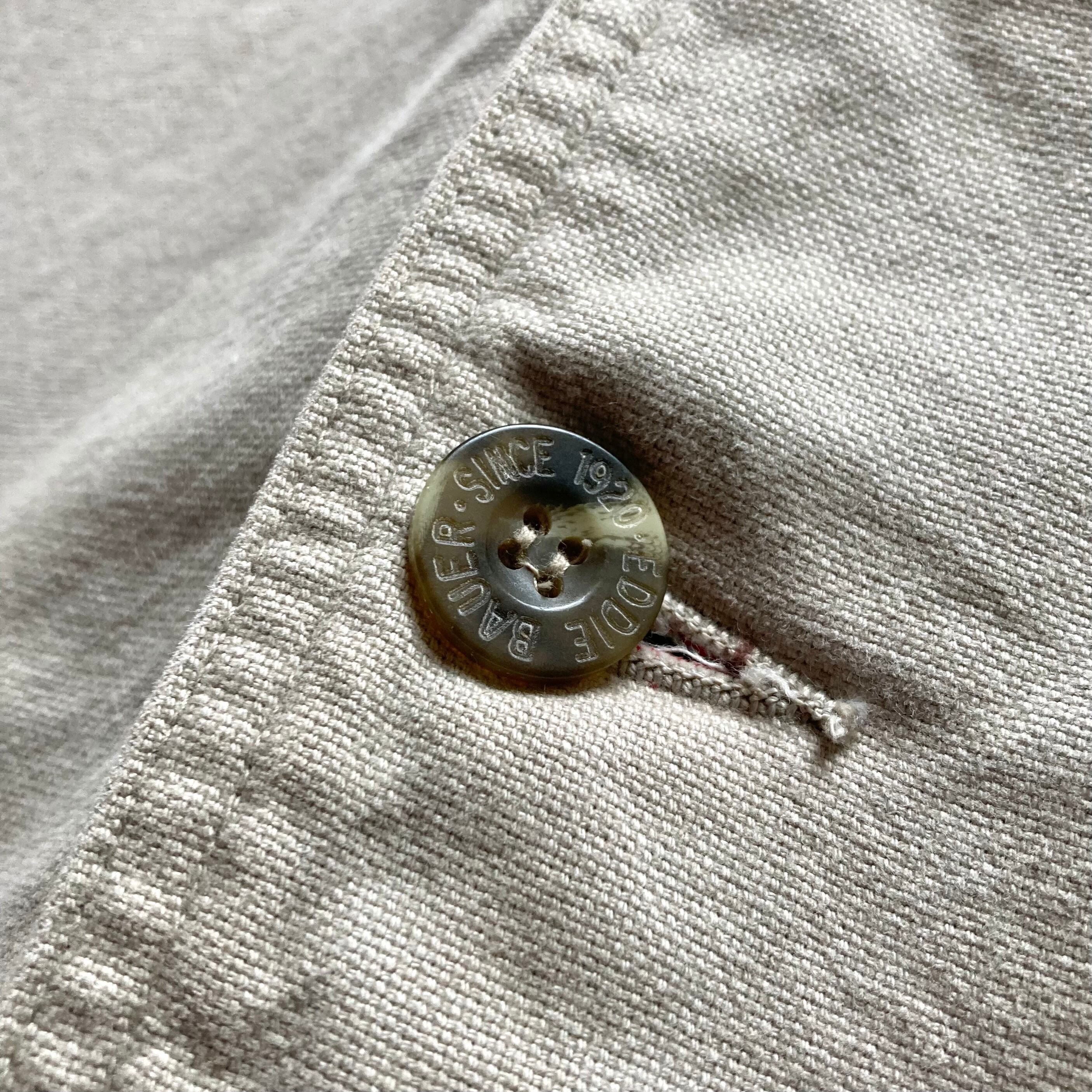 Eddie Bauerのハンティングジャケットになります。アイボリーのボディカラーに、襟がブラウンコーデュロイの切り替えにデザインされた雰囲気良い1着です。sizeLのゆったりしたシルエットですので、厚手のニットなどを着込んでも十分にゆとりがあるかと思います。