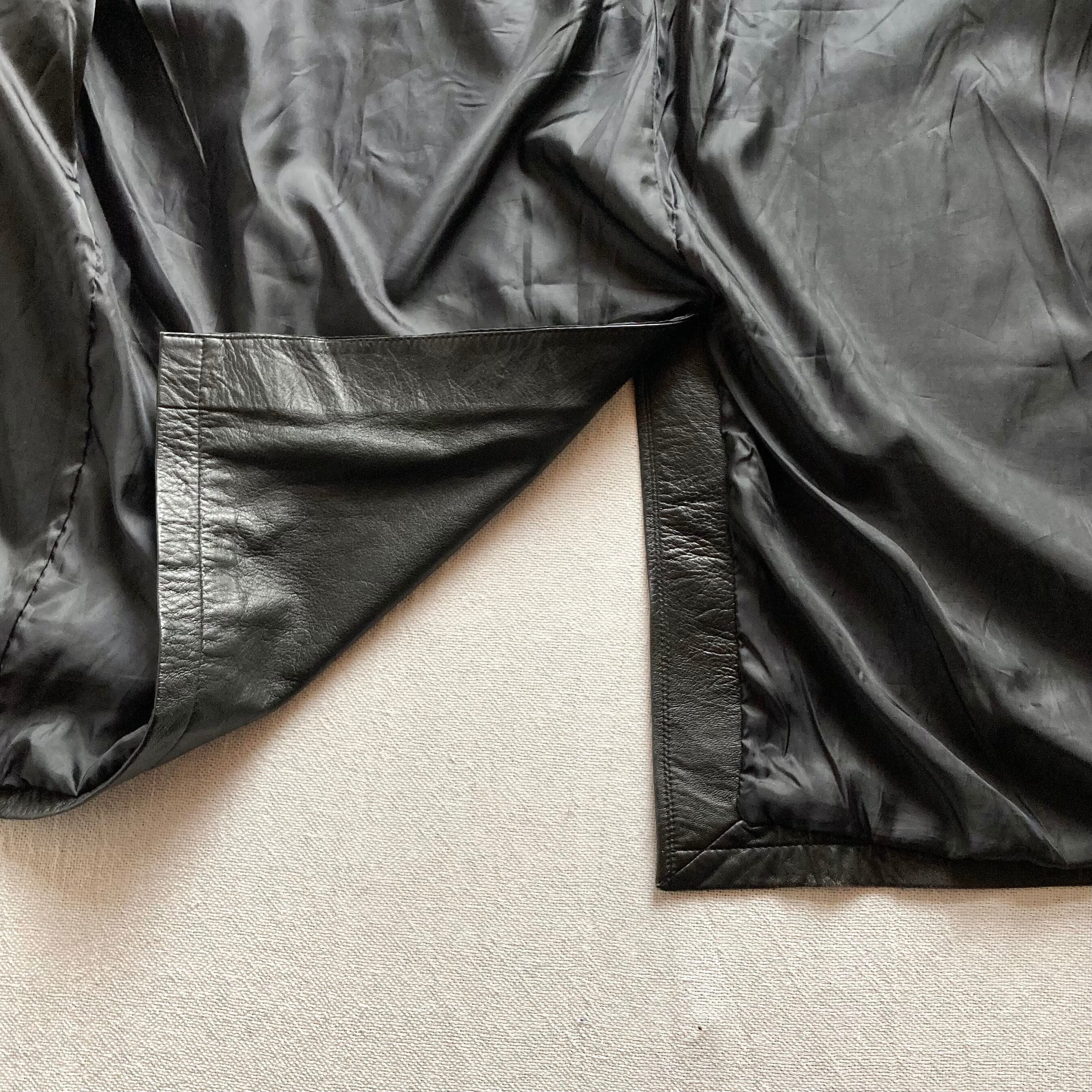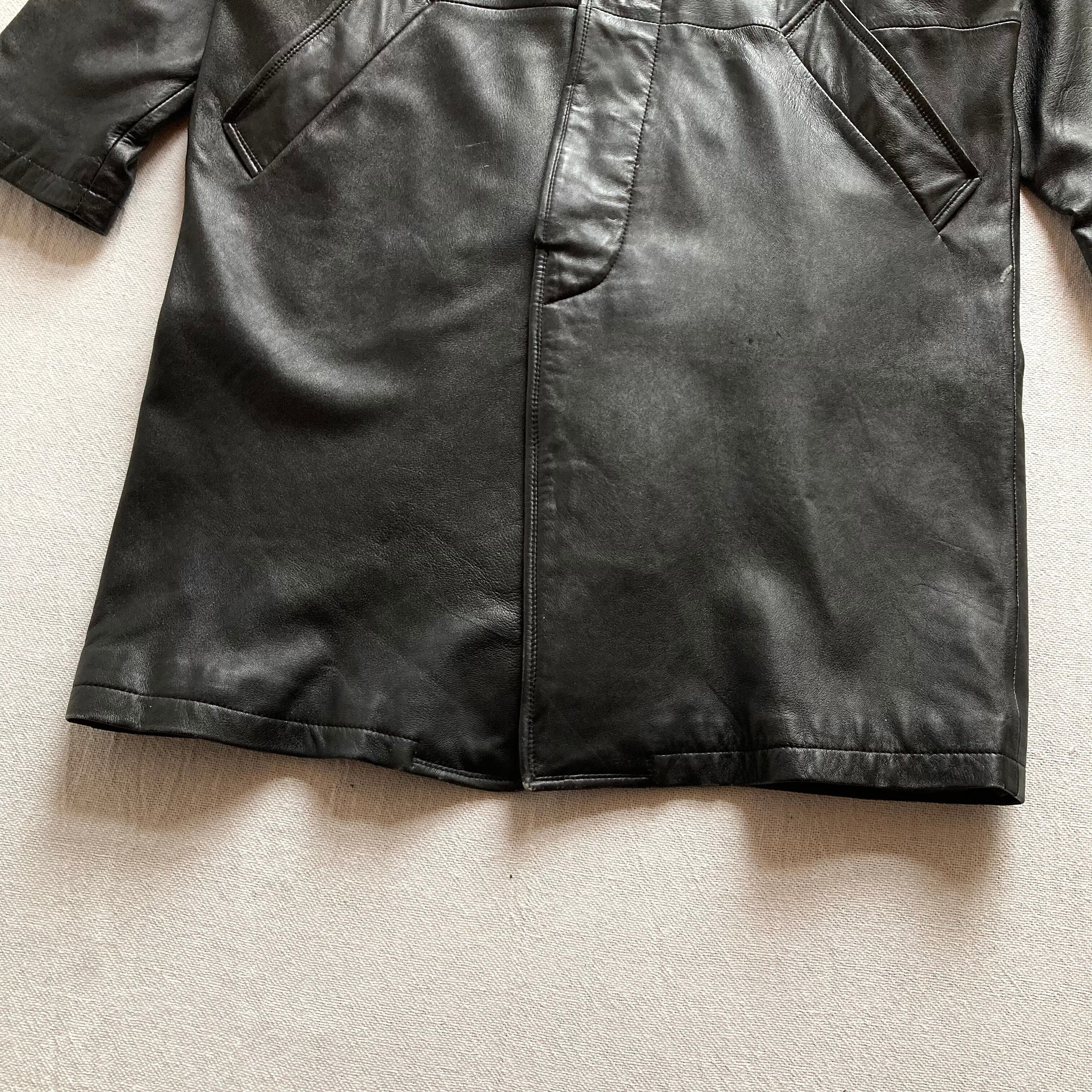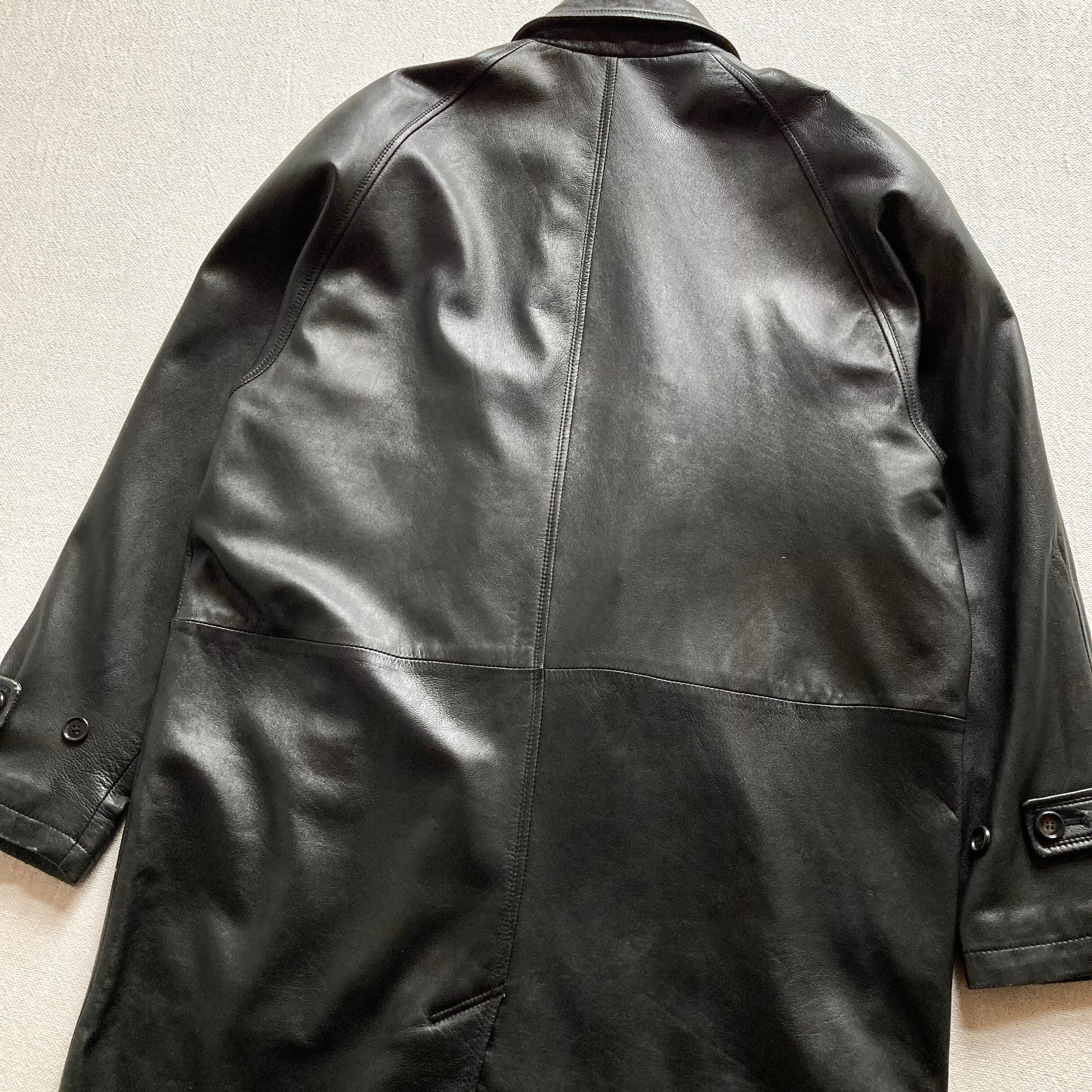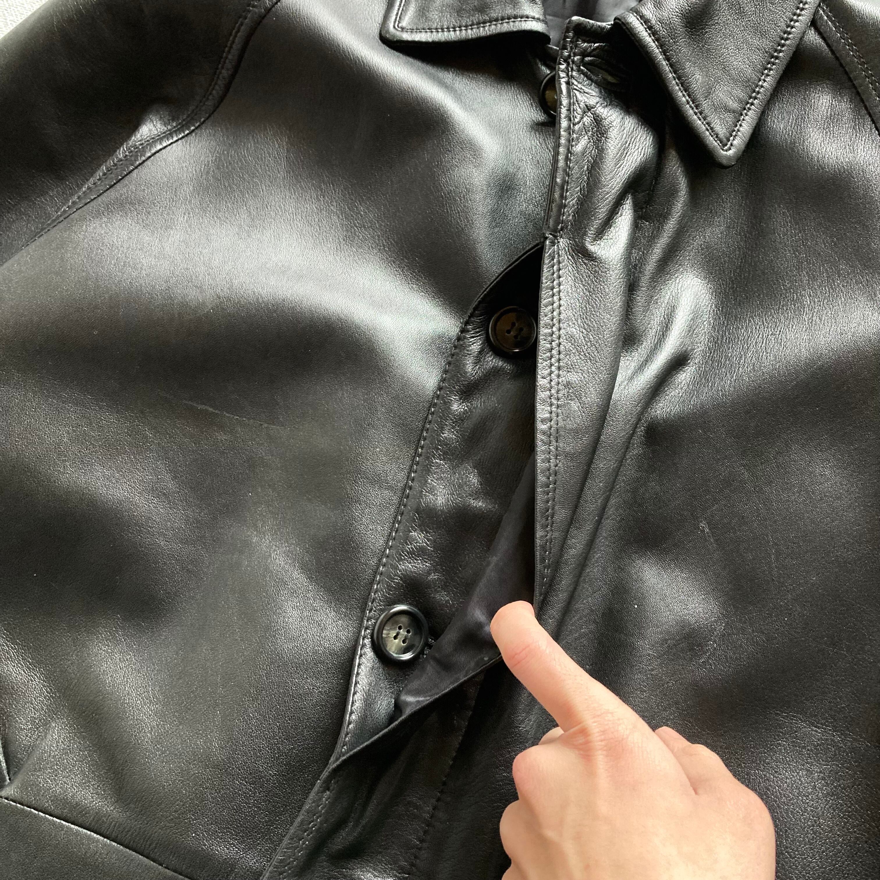 柔らかな革質のsheep leatherが使用されたロングコートになります。ノーブランド物の1着ですが、ラグランスリーブや比翼ボタン、センターベンツなどといった随所のディティールもしっかりとしており、非常に雰囲気の良い1着かと思います。レザーのコート単体だと重めの雰囲気になりやすいですが、カラービーニーなどの小物類を取り入れると、より着用しやすくなるかと思います。