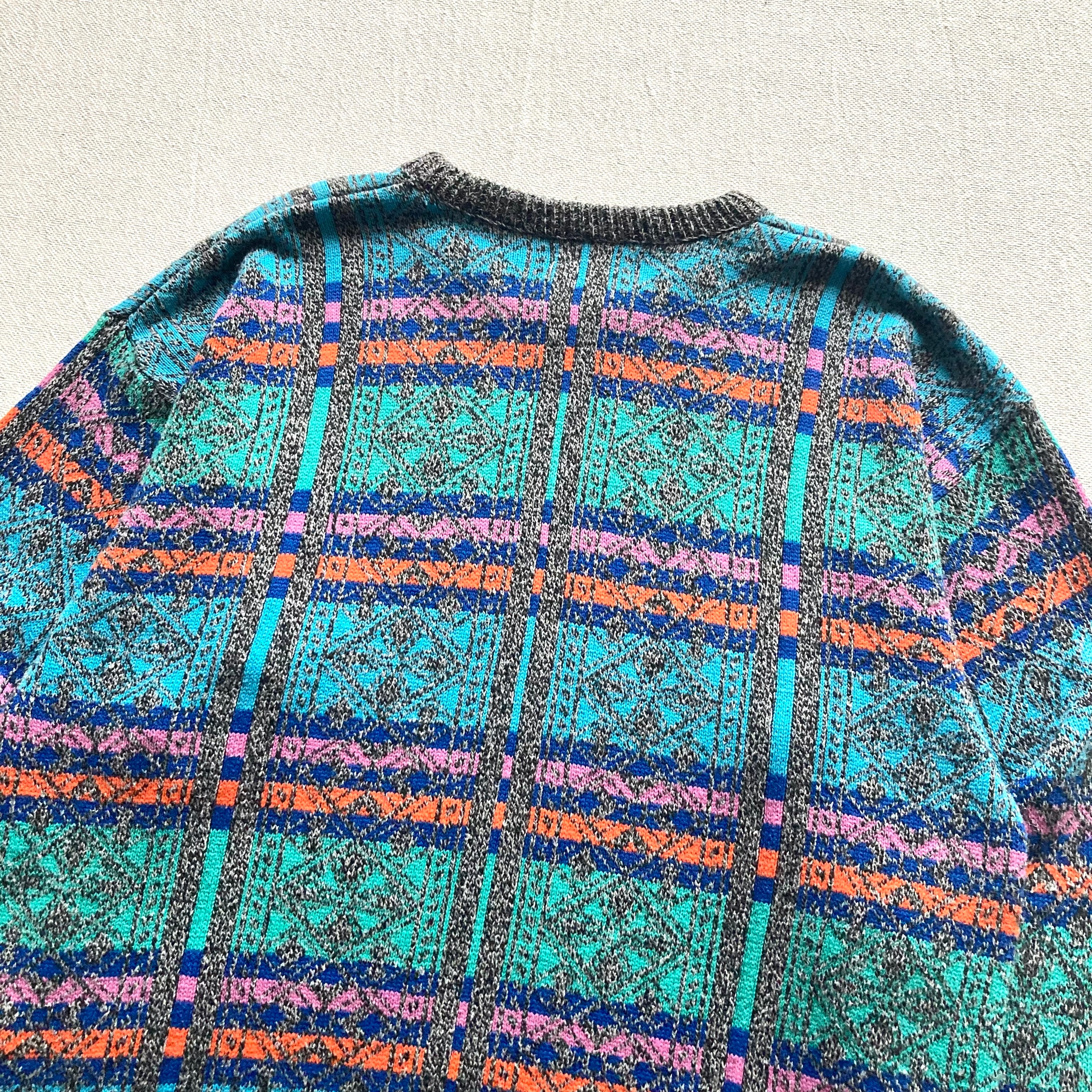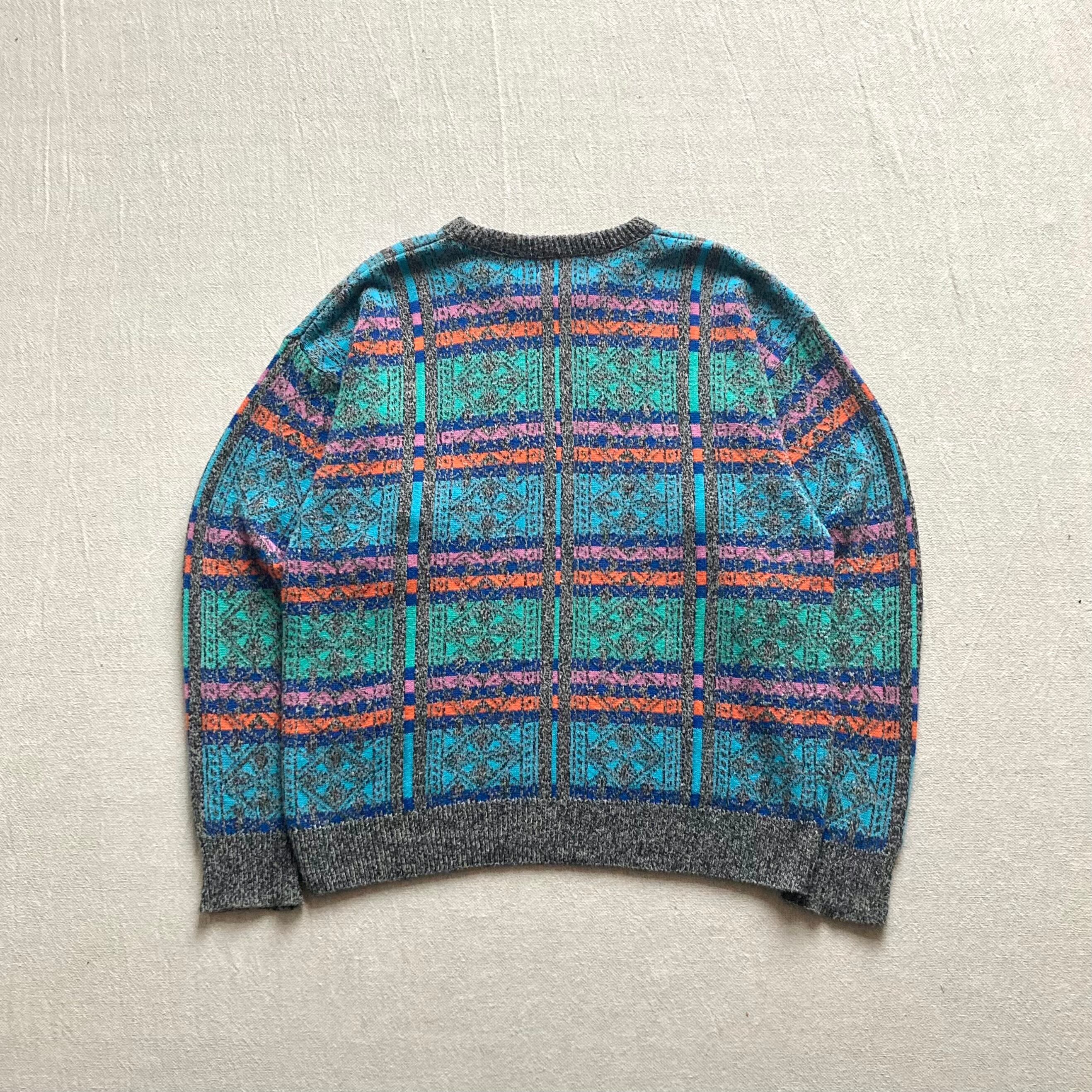 90s USA製 ROBERT BRUCE のデザインセーターになります。鮮やかな色彩のチェック柄が目を惹く1着です。近づいて見るとチェック柄の他にも幾何学的な模様が一面に施されており、細部まで凝られたデザインの1着かと思います。丈感は程よく、太めのアームホールと肩の落ち具合が、絶妙に力の抜けたシルエットとなっております。