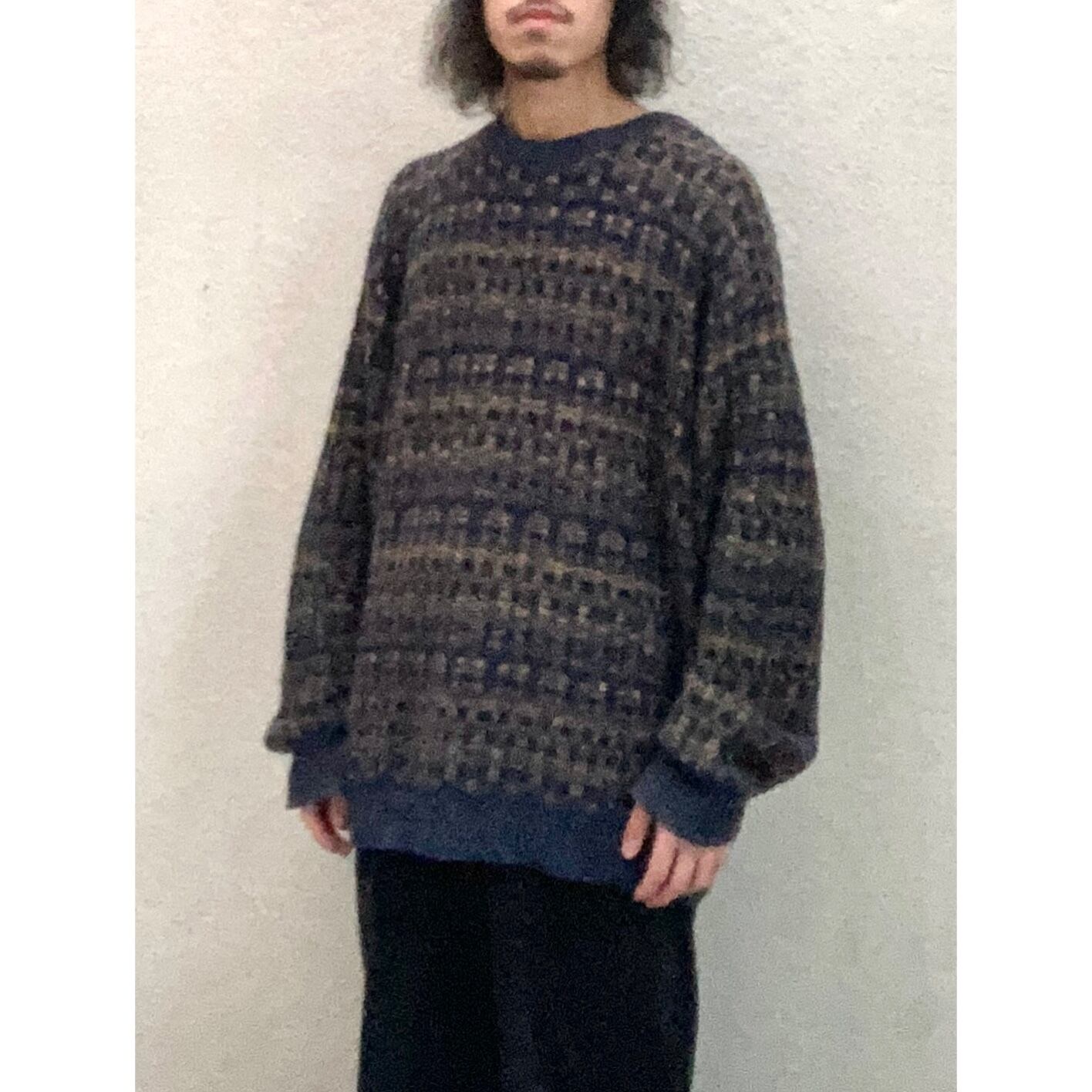 ブルー・ブラウン系の総柄がデザインされたセーターになります。落ち着いたシックな雰囲気ですが、オーバーサイズシルエットのゆったりと力の抜けた緩さも魅力の1つかと思います。1枚で様になる1着になるかと思いますので、様々な場面で重宝してくれるかと思います。