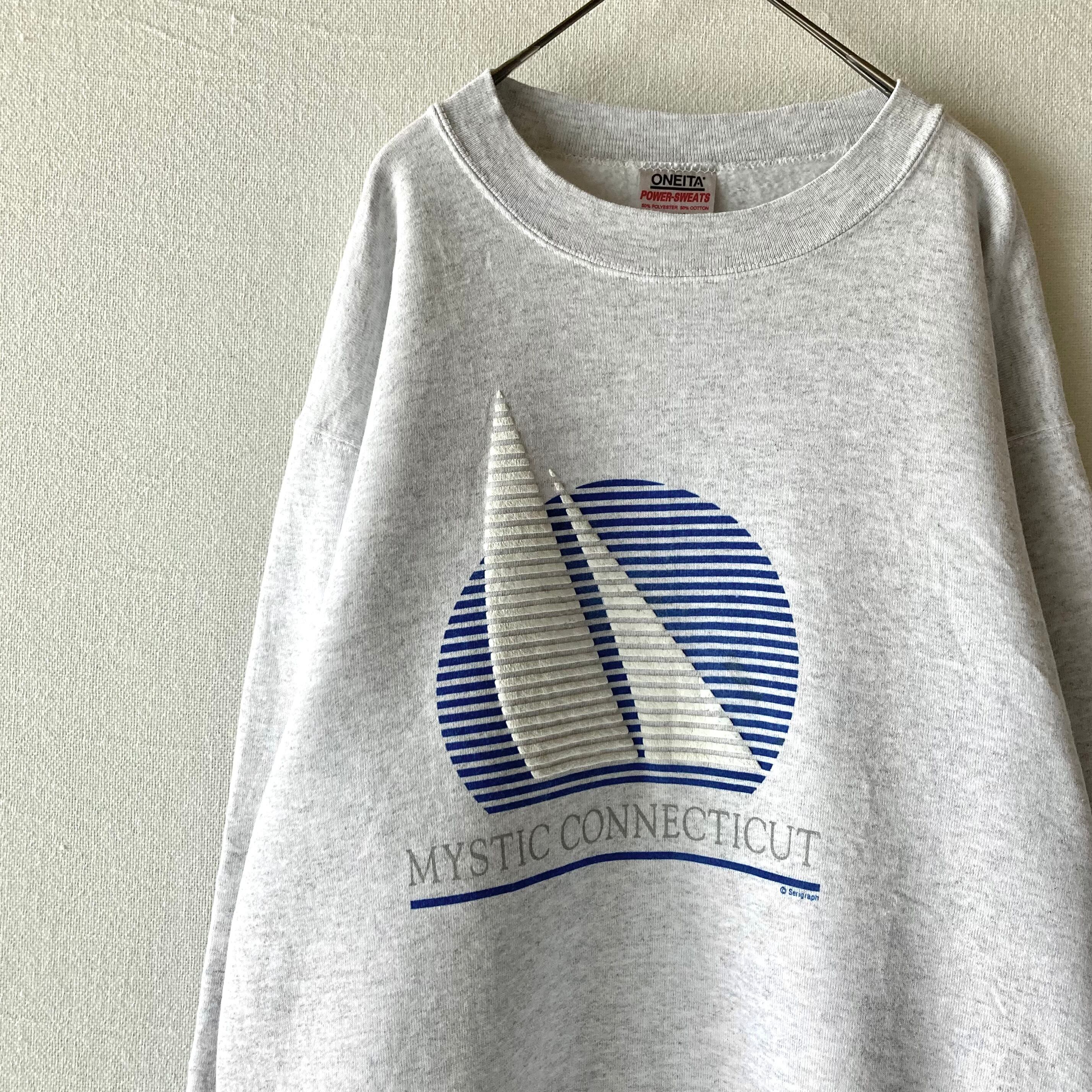 80s〜90s USA製 ONEITA のprint sweatになります。米国のMysticという村のロゴがデザインされた、爽やかでartisticな雰囲気の1着です。ヨット部分はラバー仕様のため凹凸があり、細かにデザイン性が高いです。