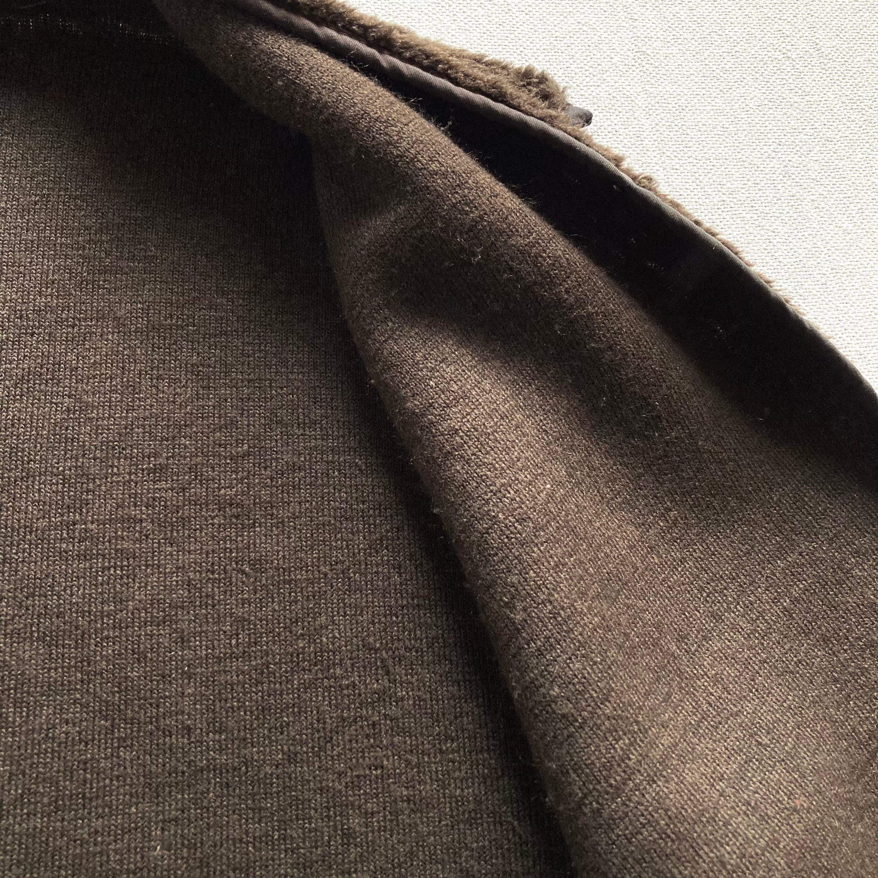 ダークブラウンカラーのfur liner vestになります。 ファーベストというとBarbour バブアー が有名ですが、こちらはダークブラウンカラーの落ち着いた雰囲気に加え、背部に内タグの無いミニマルな1着ですので、より着用して頂きやすいデザインとなっております。表記無しですが、サイズはL〜XL程度ありそうです。