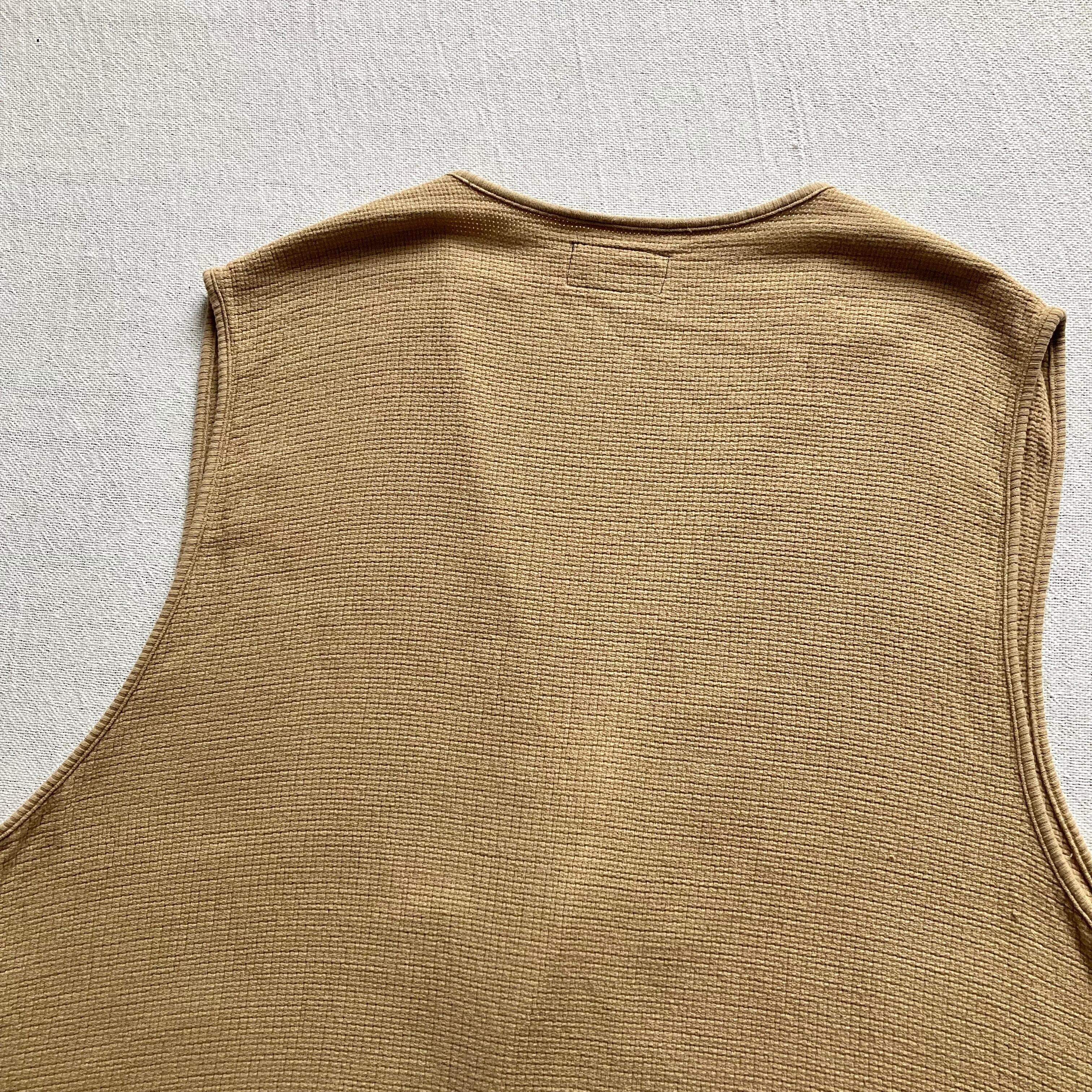USA製のcotton vestになります。お尻が隠れる長めの丈感とゆとりあるシルエット、サンドベージュカラーの粗めの生地が特徴的な1着です。