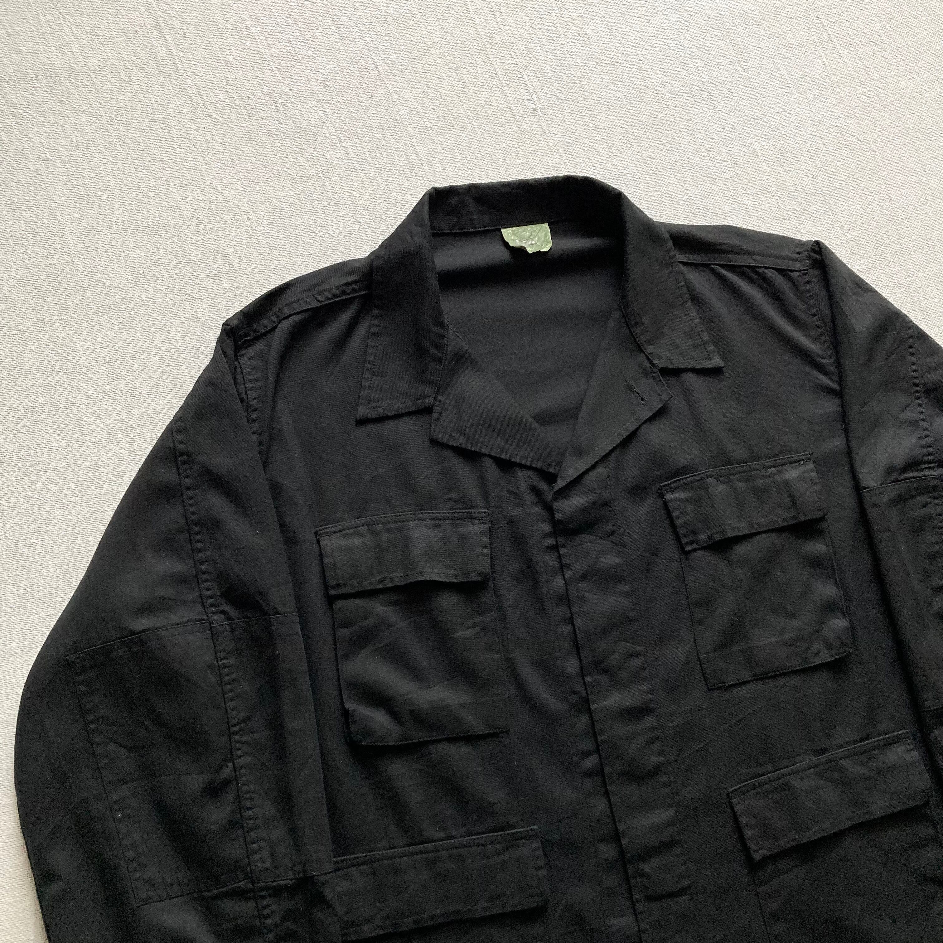 ROTHCO製のBDU SHIRT JACKETになります。薄手で春らしい生地感のブラックカラーツイル地と、カバーオールタイプのゆったりとしたボックスシルエットが特徴的な一着です。