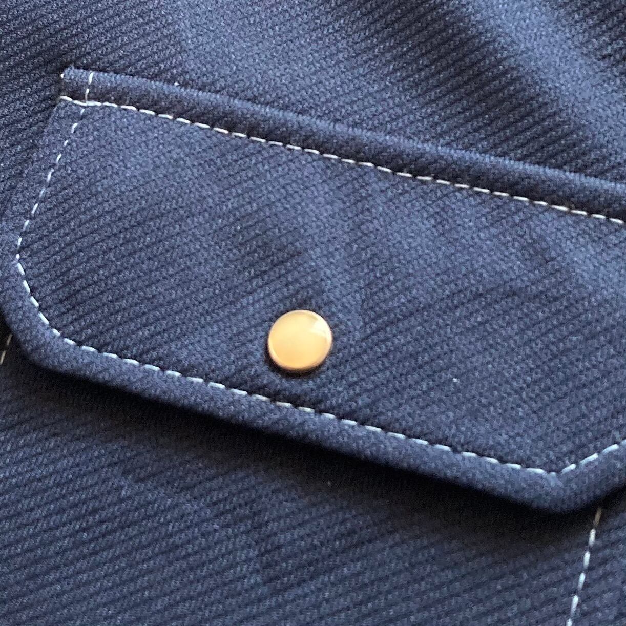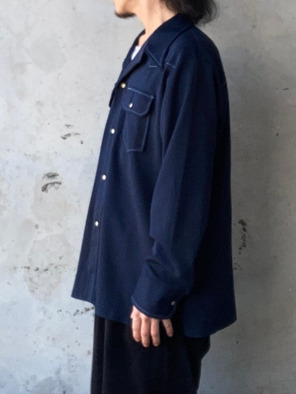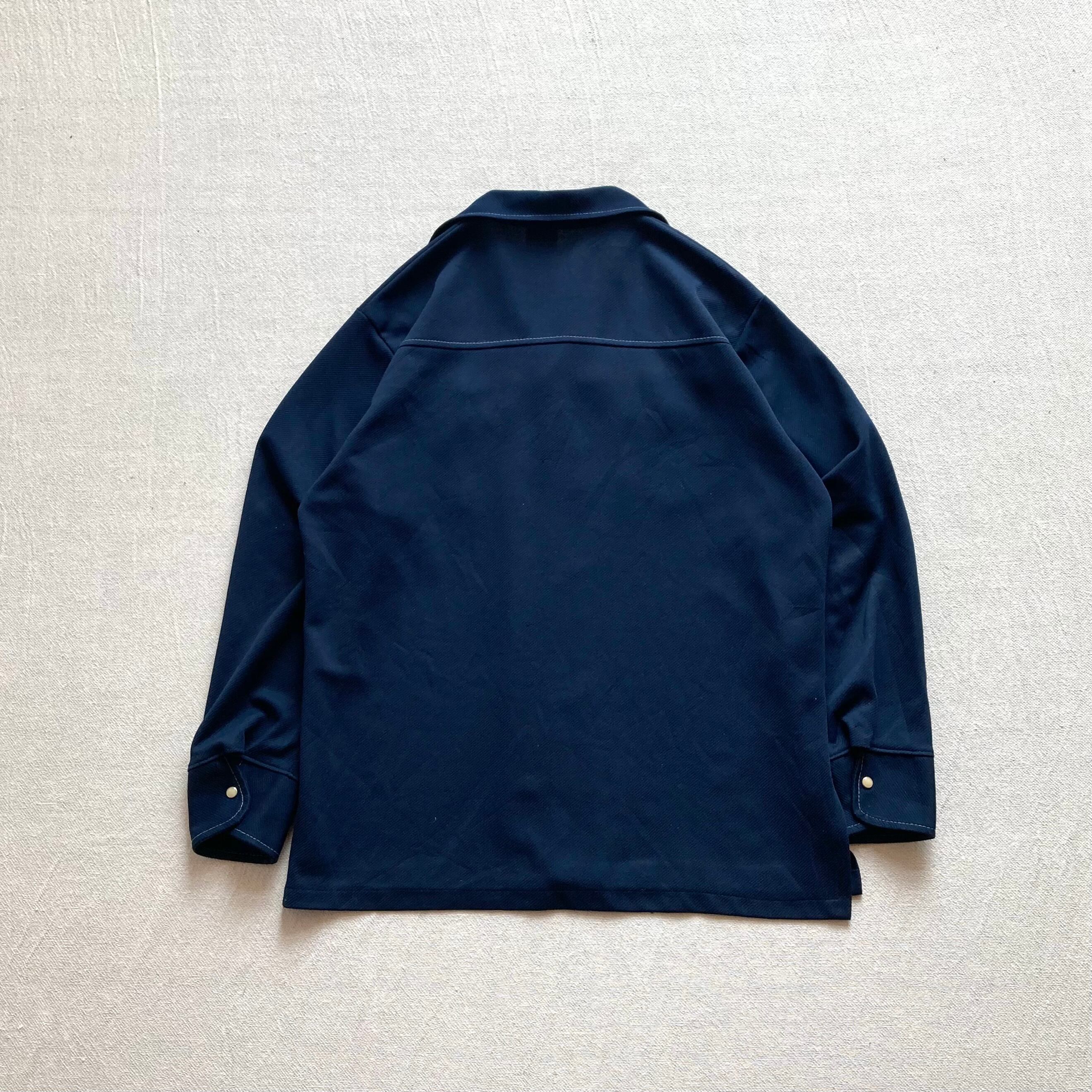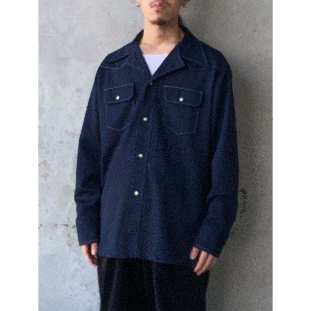 70s BIG YANKのオープンカラーウエスタンシャツになります。ダークネイビーの落ち着きある色味、パリッと張り・厚みのあるポリ生地、随所のホワイトステッチが特徴的な一着です。