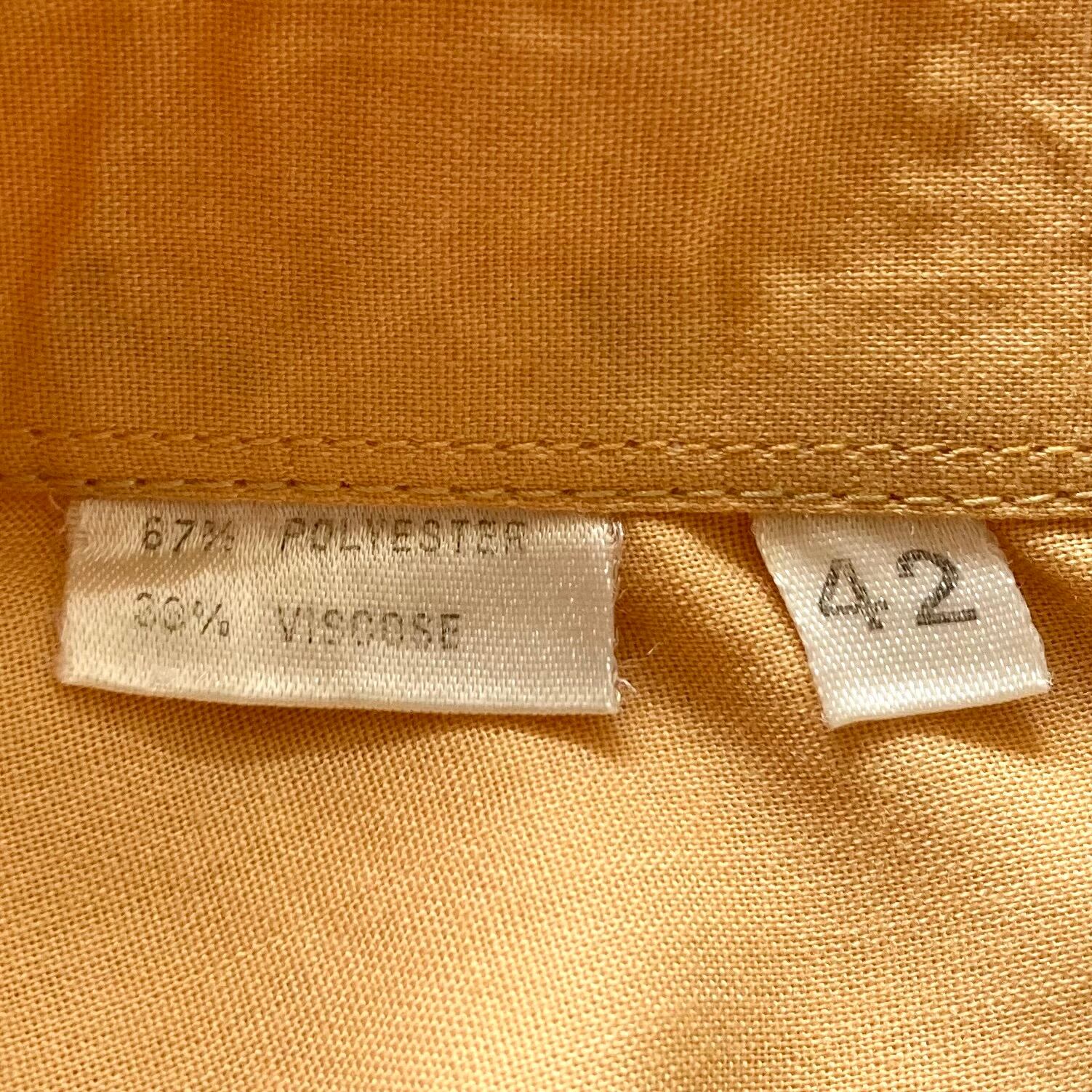 春らしい雰囲気のイエローカラー、薄手で透け感のあるポリレーヨン生地、独特なボタンデザインが特徴的な1着です。