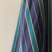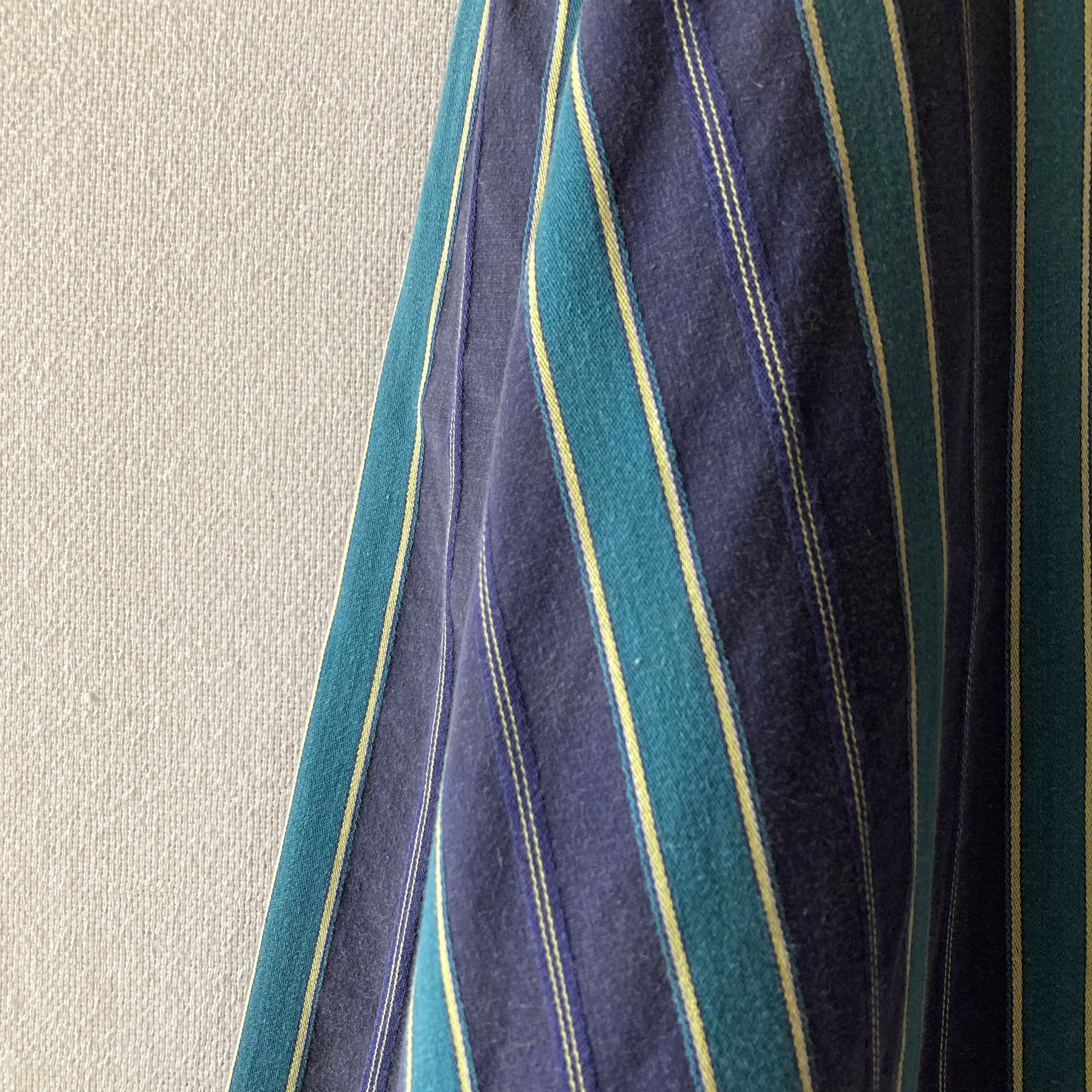 雰囲気ある掠れた風合いのコットン地に、ブルーパープル系のマルチストライプが特徴的な1着です。パジャマらしい開襟仕様、広めの身幅・アームホールで、ボックスシルエットに近いバランスの良い形となっております。