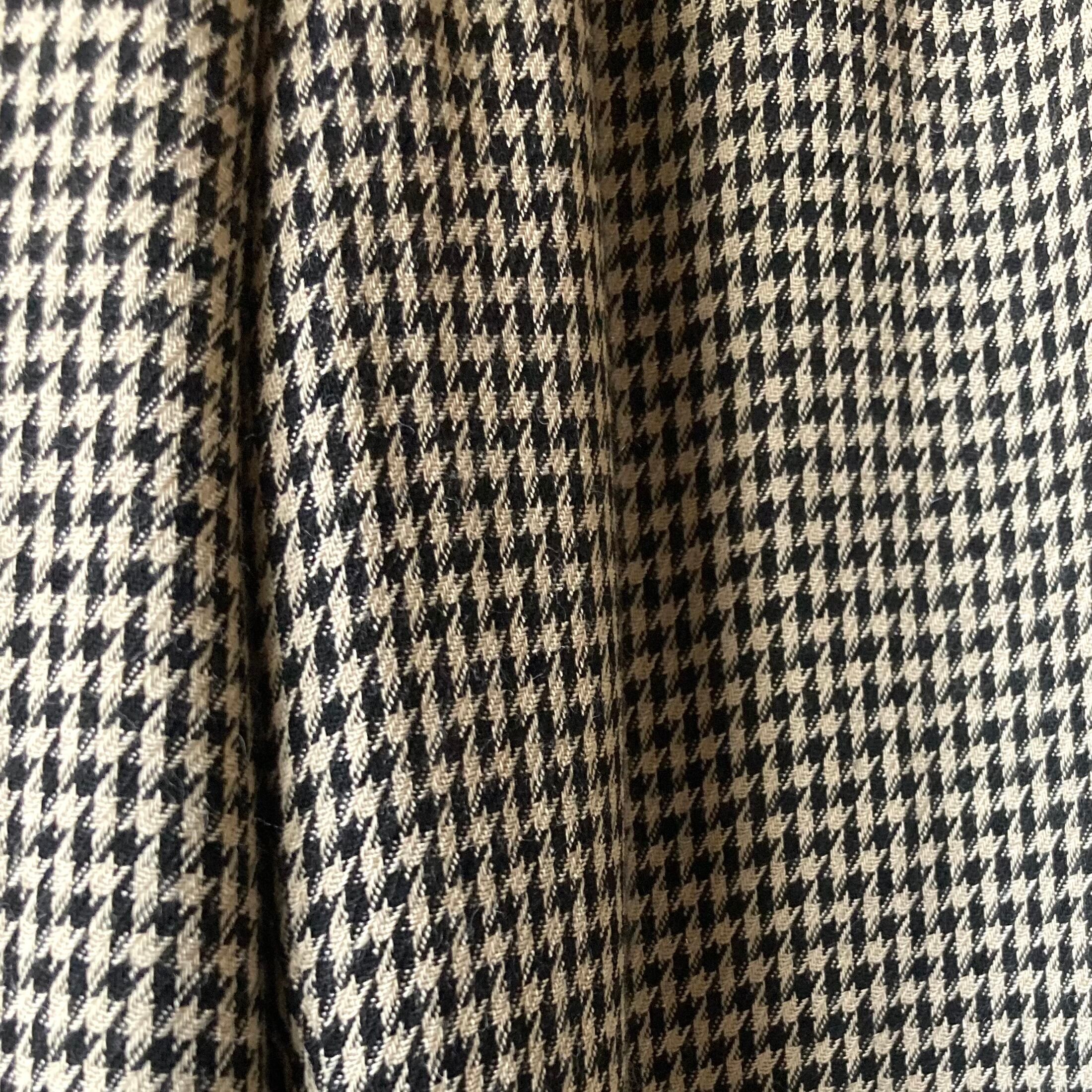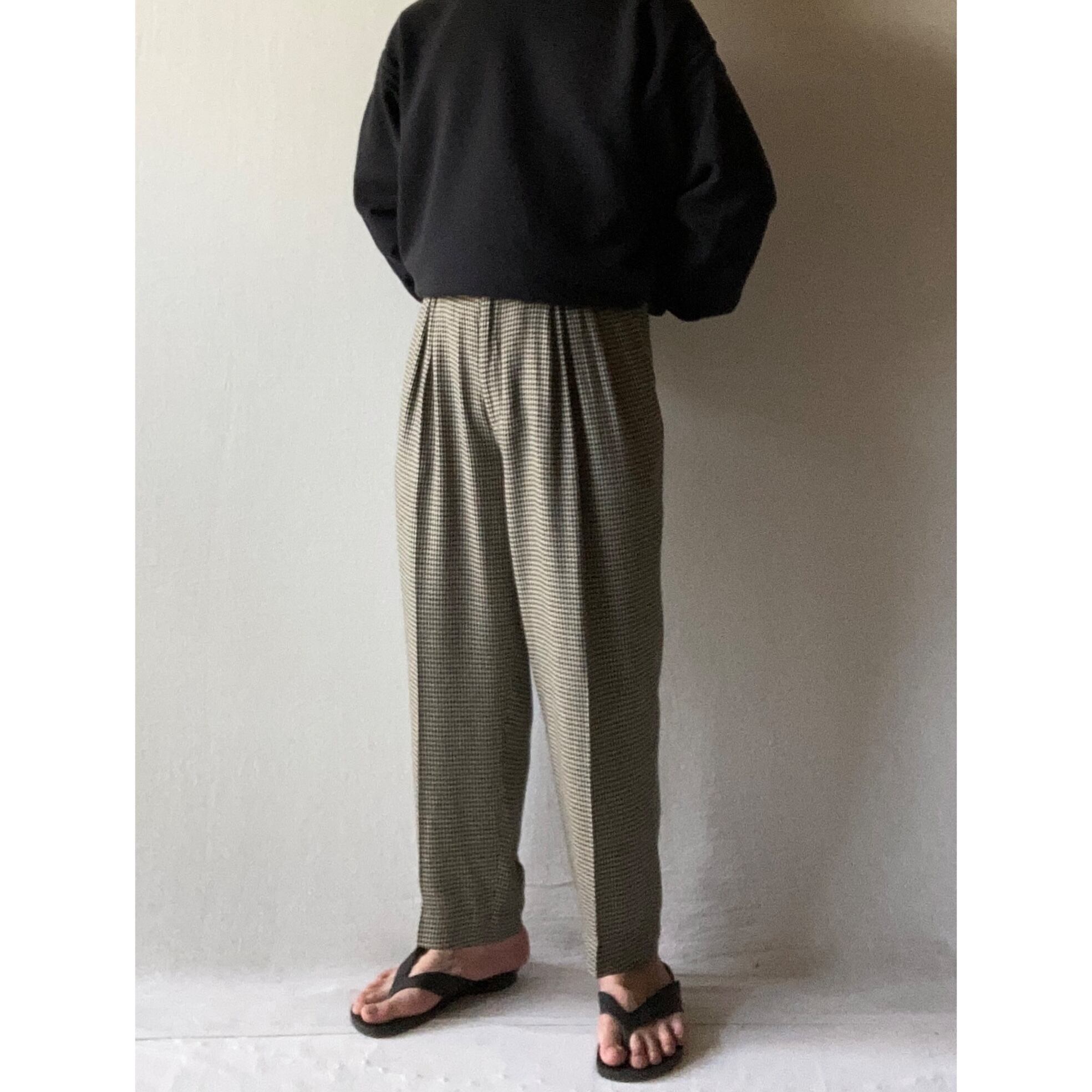 全体に施された細やかな千鳥柄、レーヨン・ポリ・シルク混の非常に柔らかで軽い生地感が特徴的の一本です。独特なプリーツの入り方も面白く、すっきりとした丈感も涼しげな雰囲気を感じます。