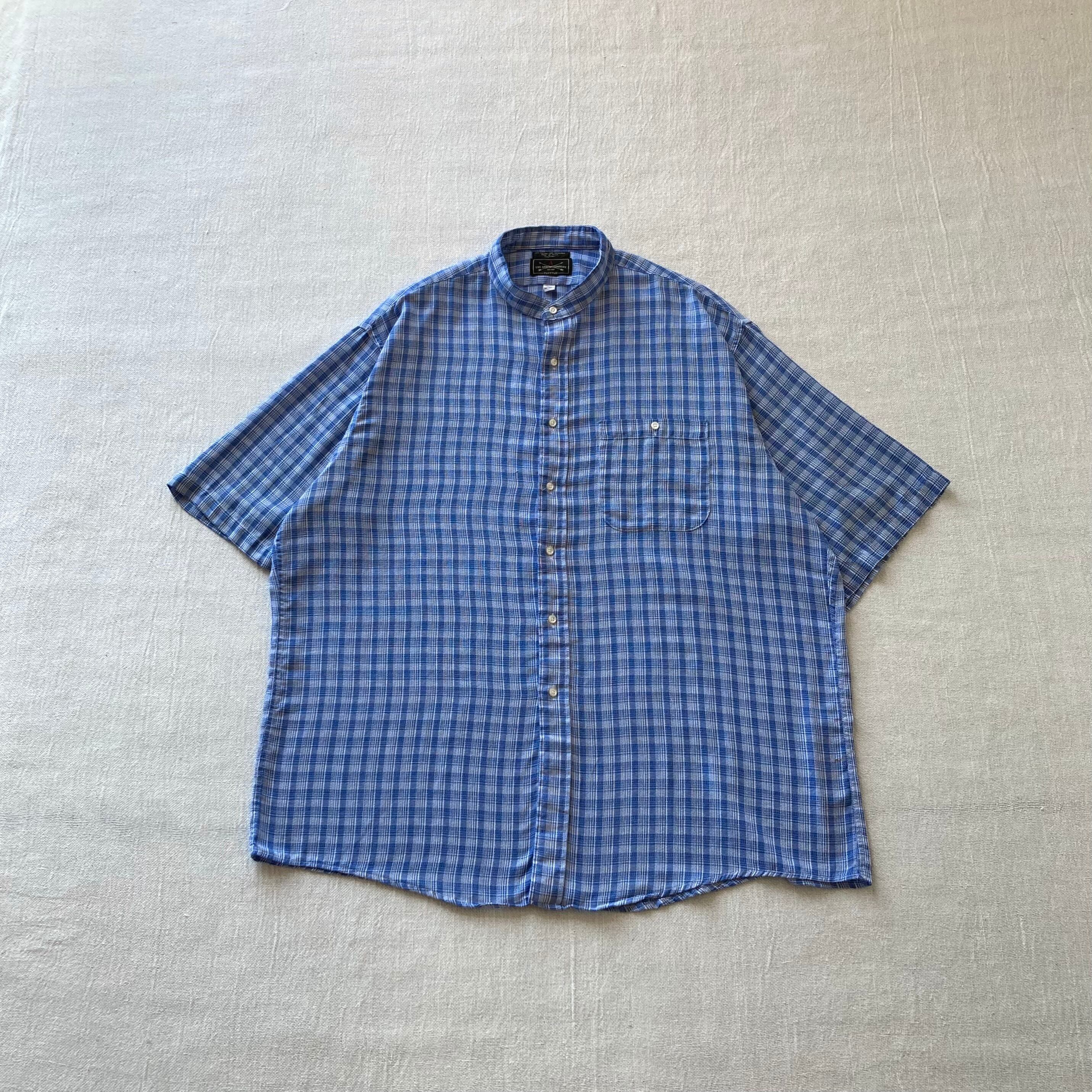 リネンに似た薄手で透け感のあるポリコットン生地に、すっきりとした雰囲気のバンドカラー、爽やかなブルーチェックが特徴の1着です。