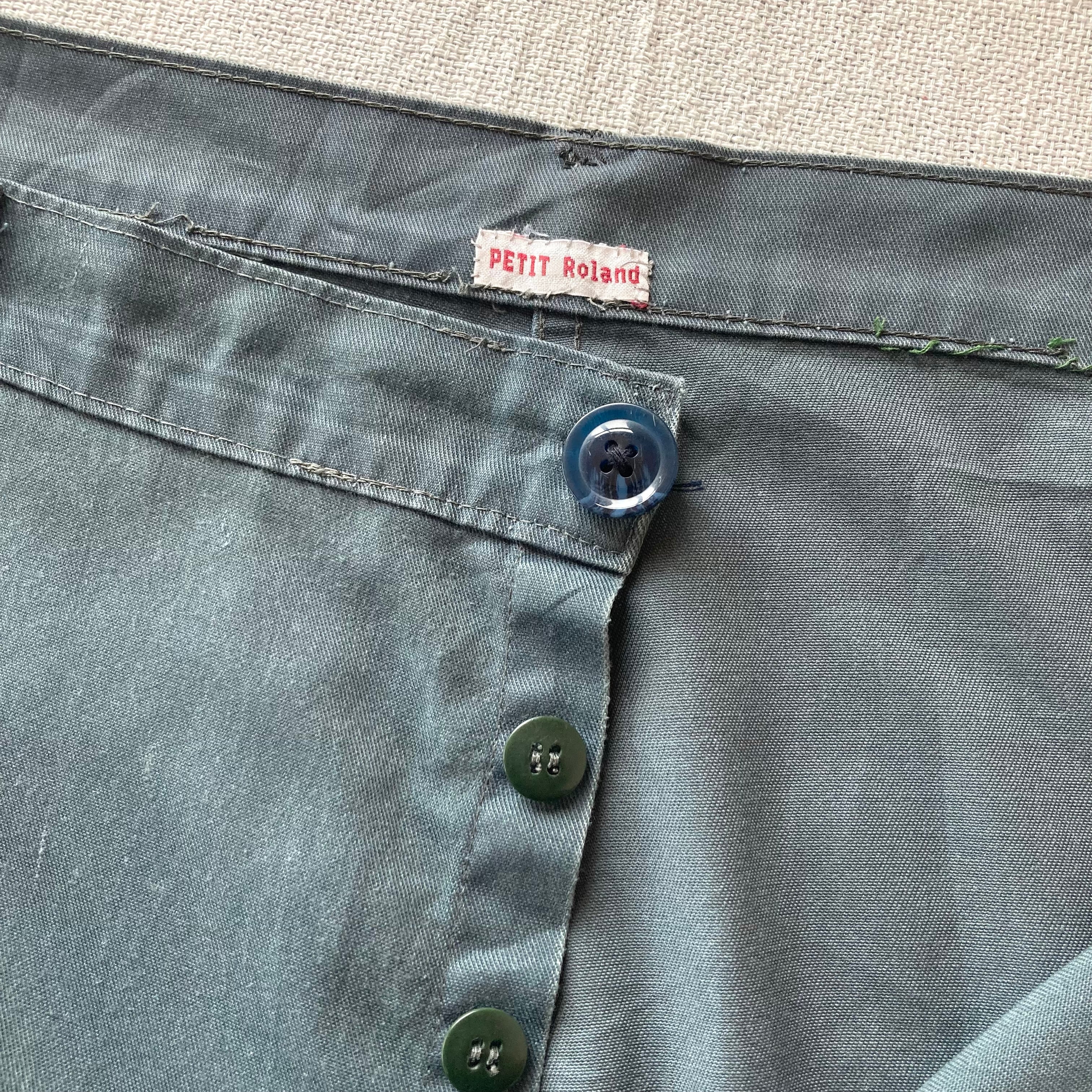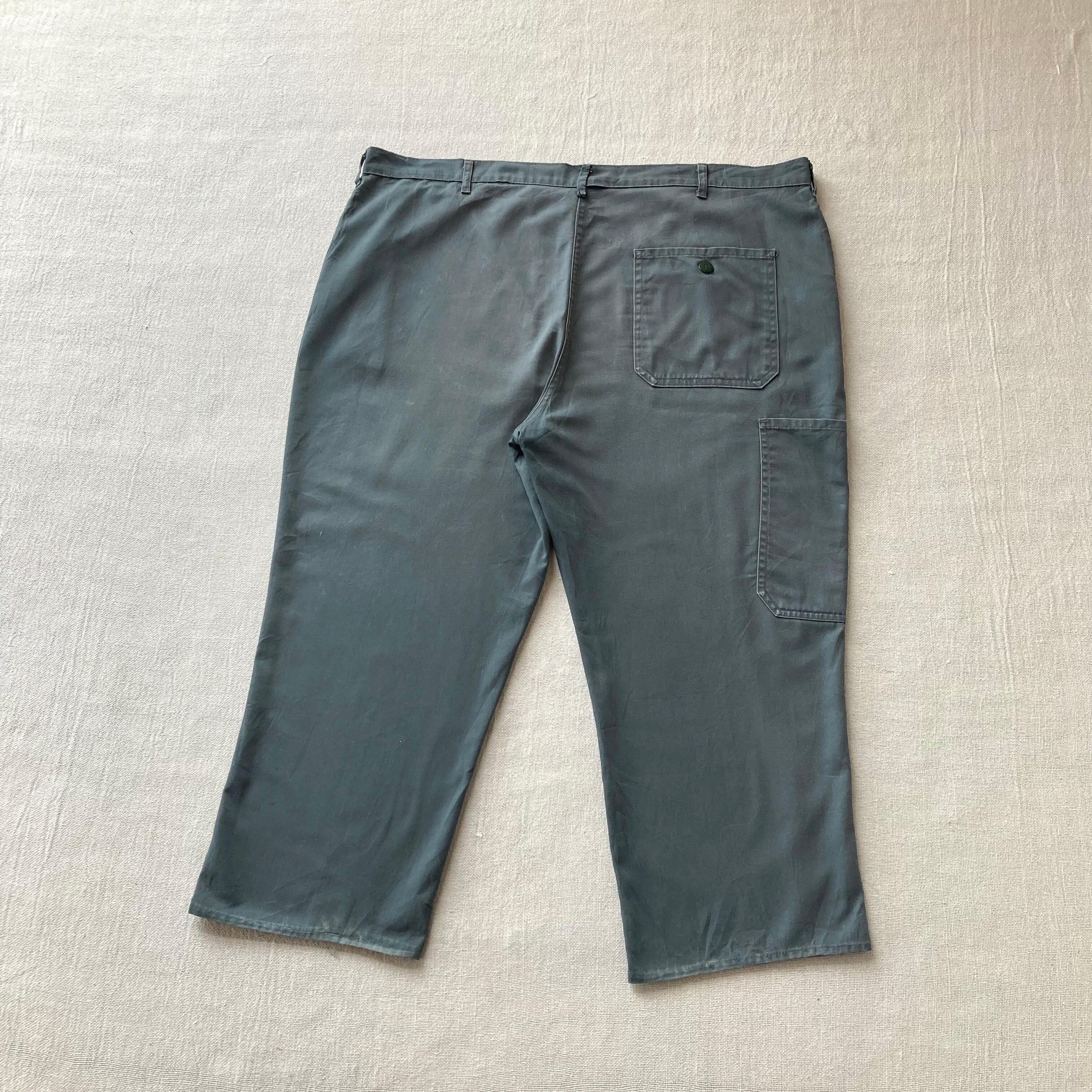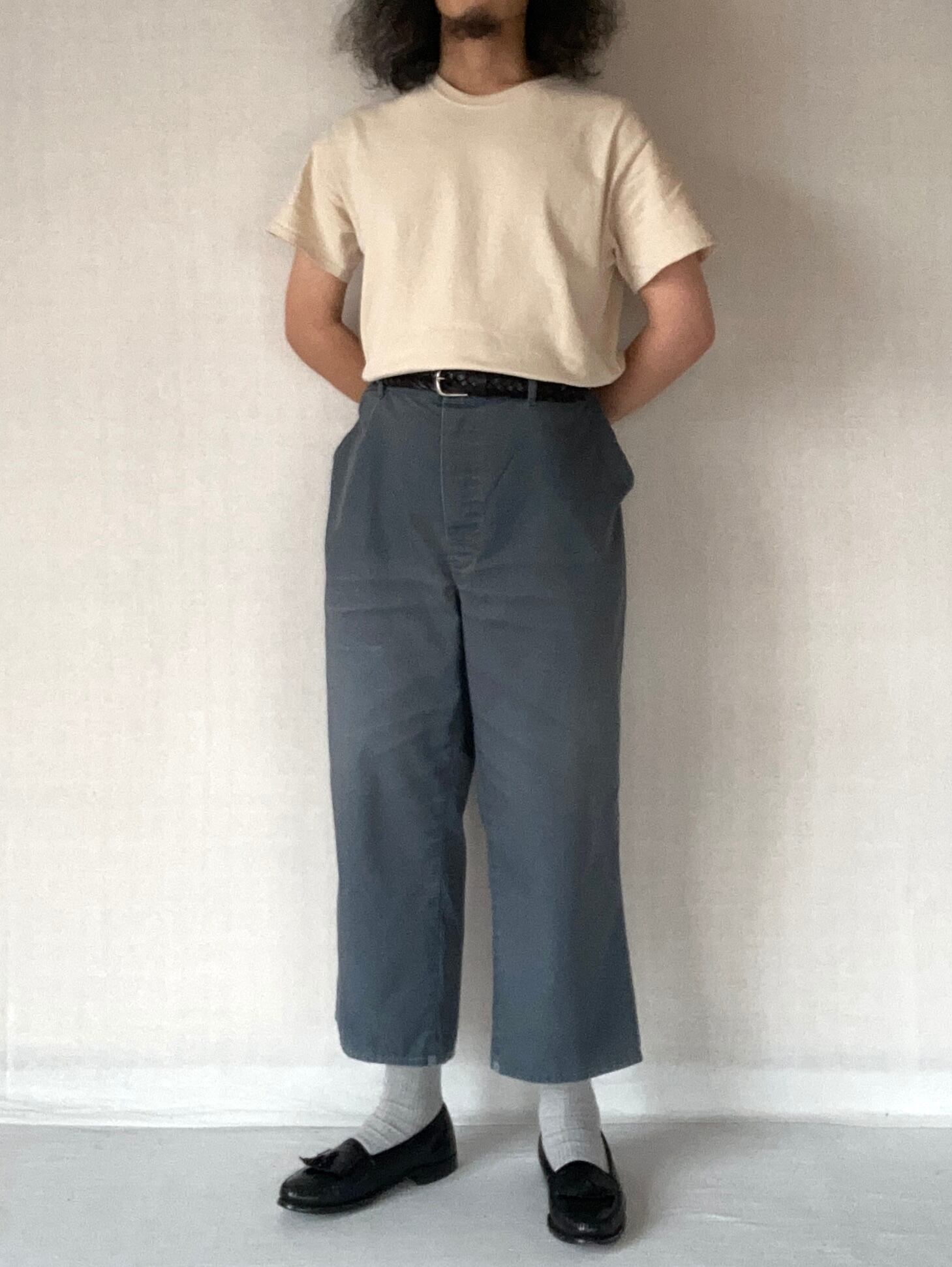 dirtyなoliveの色味と短い丈感が雰囲気の良いEuro work pantsになります。詳細な表記無しですが、タグからFrance製の一本かと思われます。