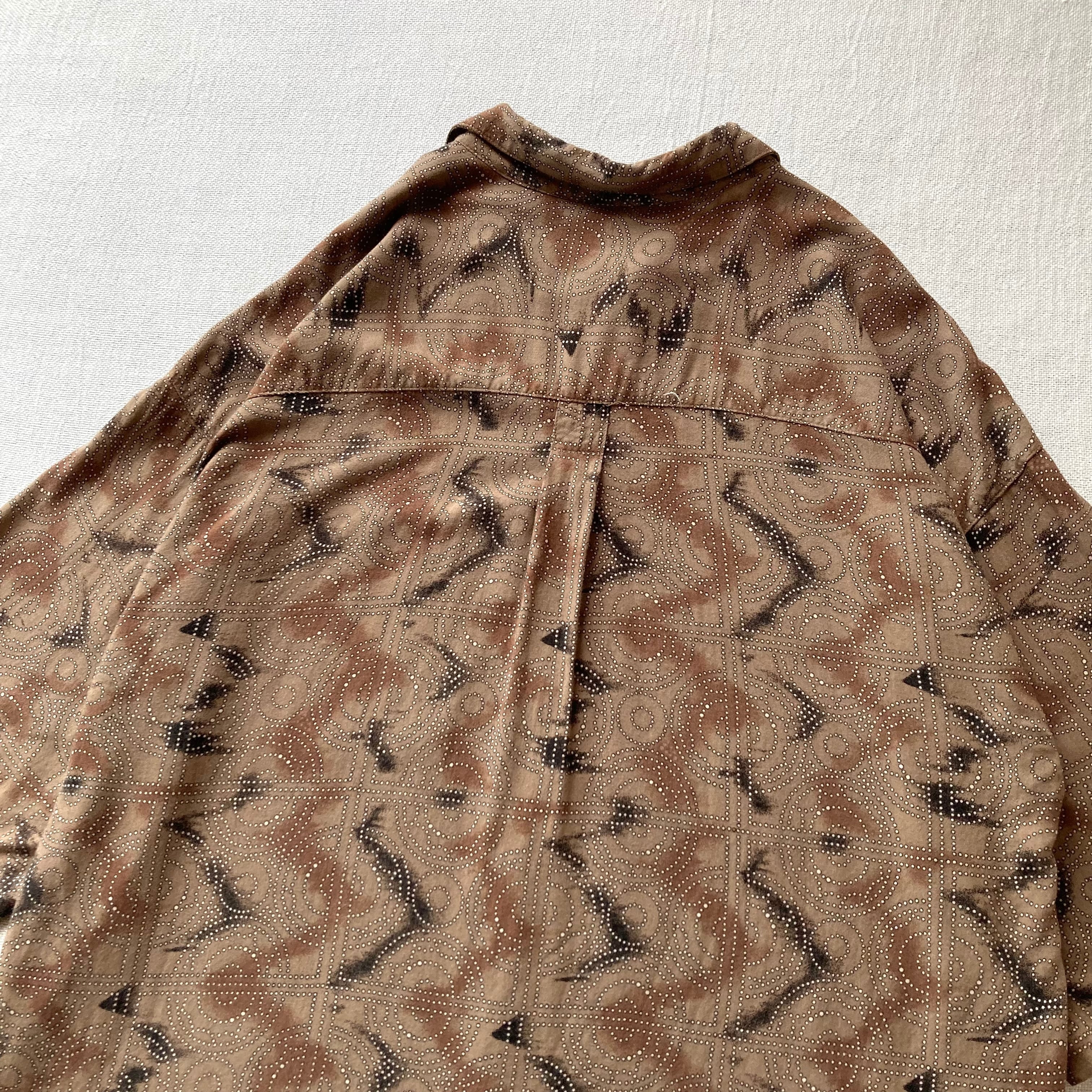 brown baseの rayon生地に総柄が施されたオープンカラーシャツになります。