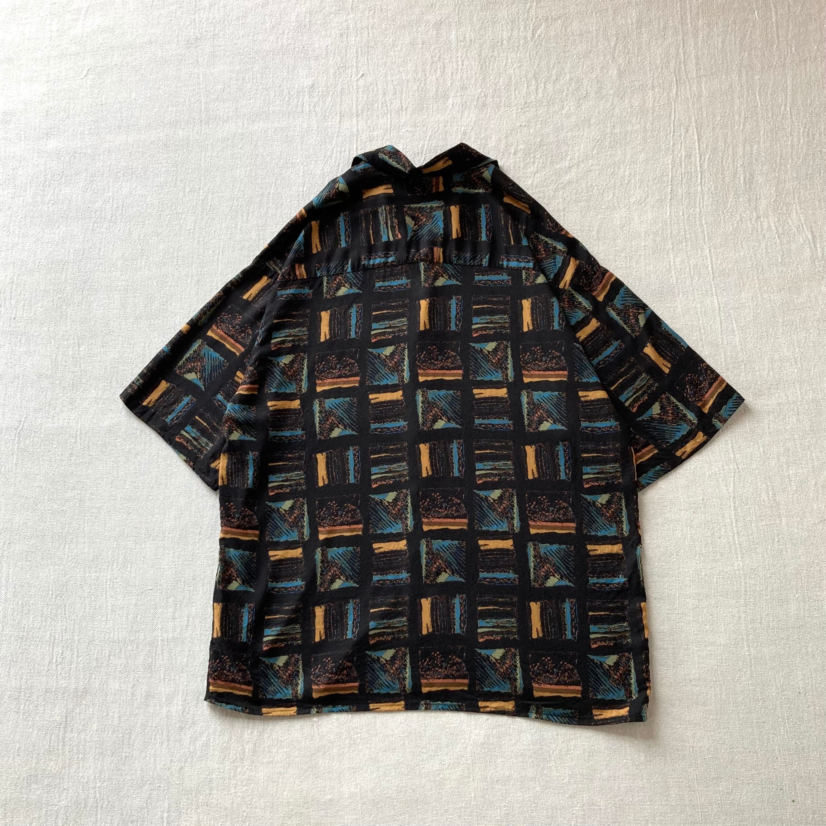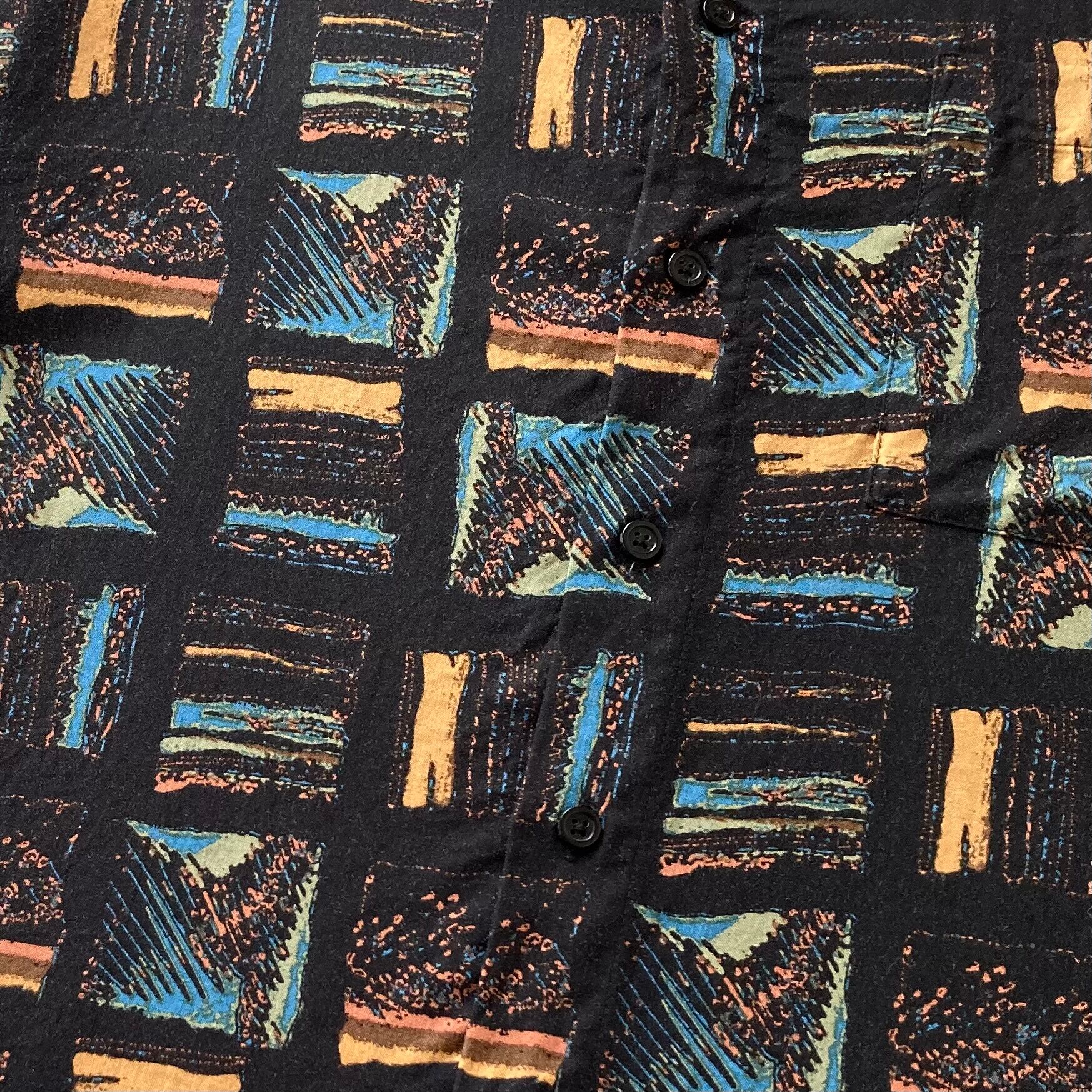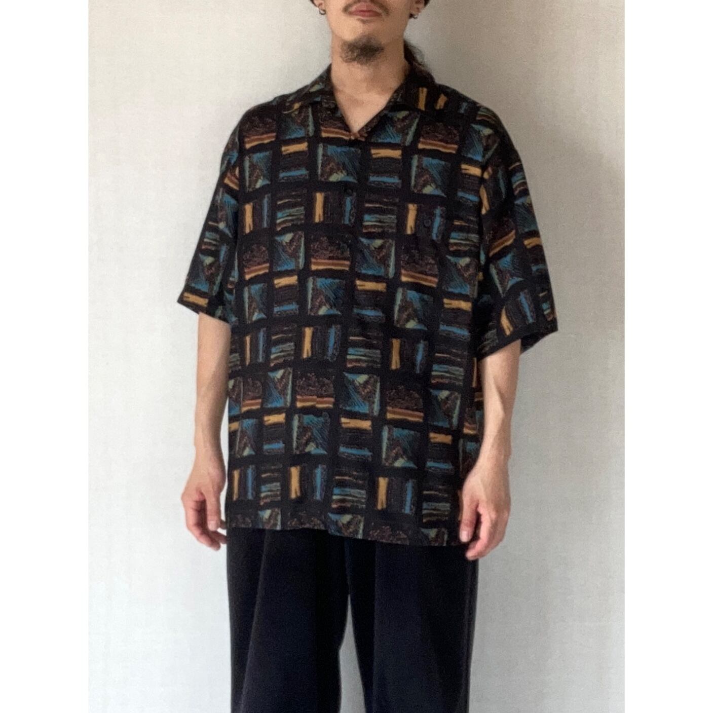 black baseの生地に総柄が施されたオープンカラーシャツになります。