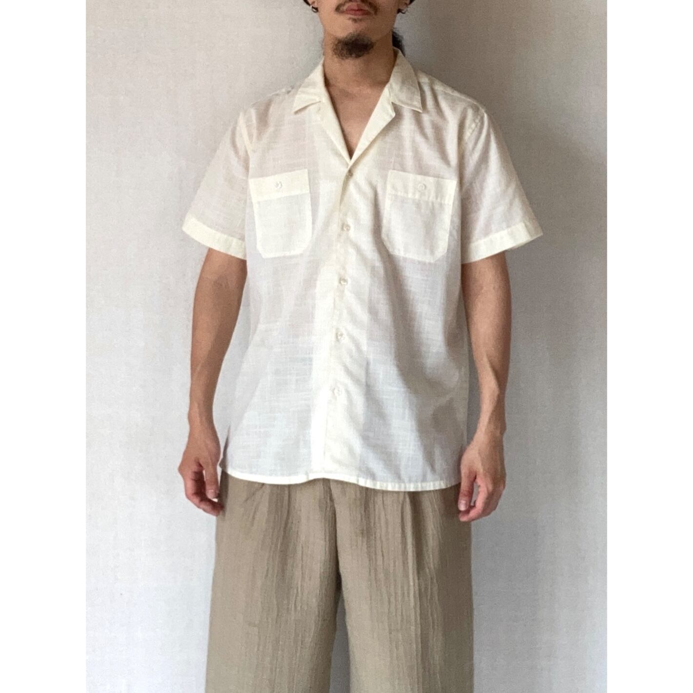 linenに似た透け感のあるポリコットン生地に、すっきりとしたジャストシルエットが特徴的な1着です。太めのdenimや easy pants等と相性良いかと思います。