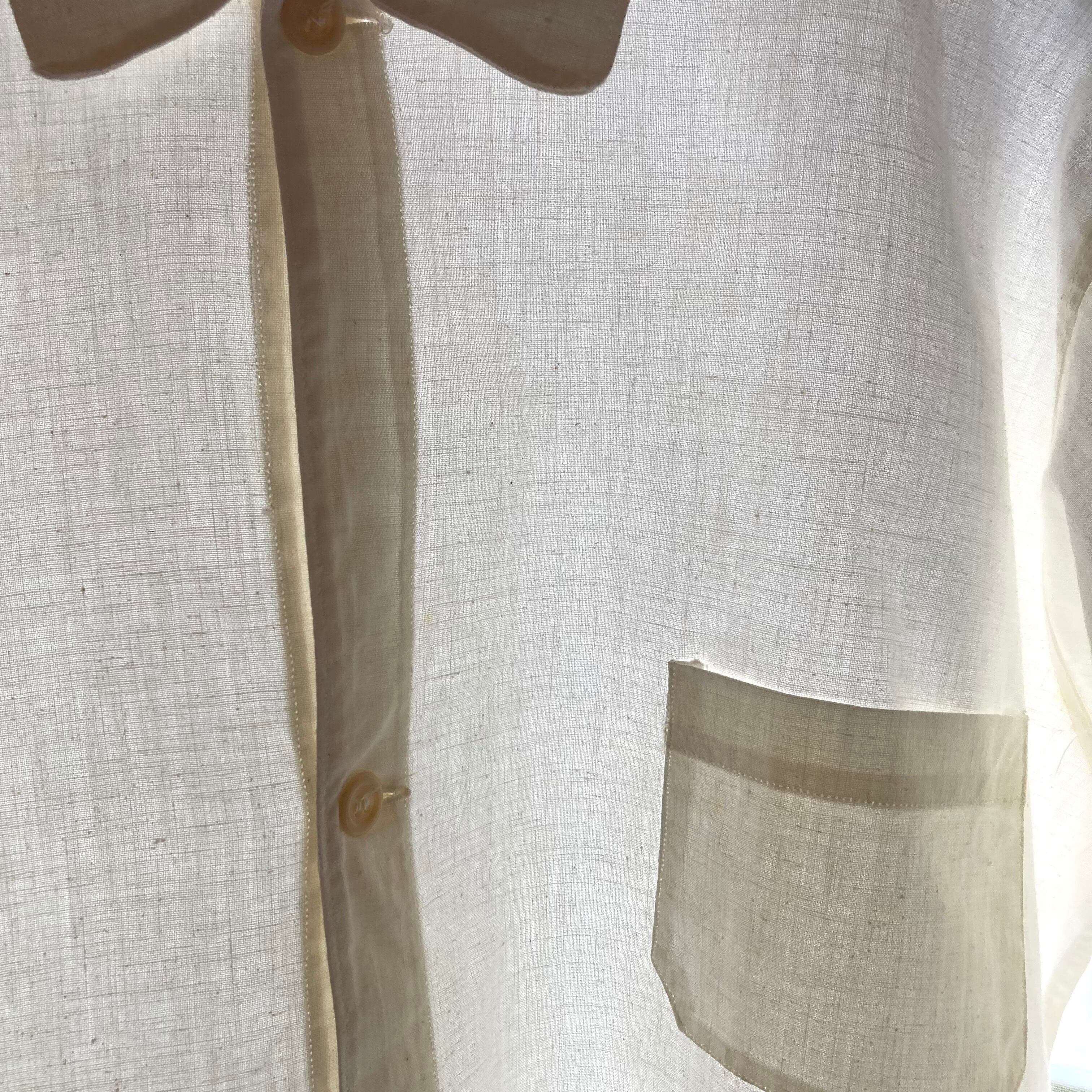 粗野で張りのあるコットン地(リネン混?)、プルオーバー仕様、サイドスリット、フロント・袖先のプリーツなど特徴的な1着です。