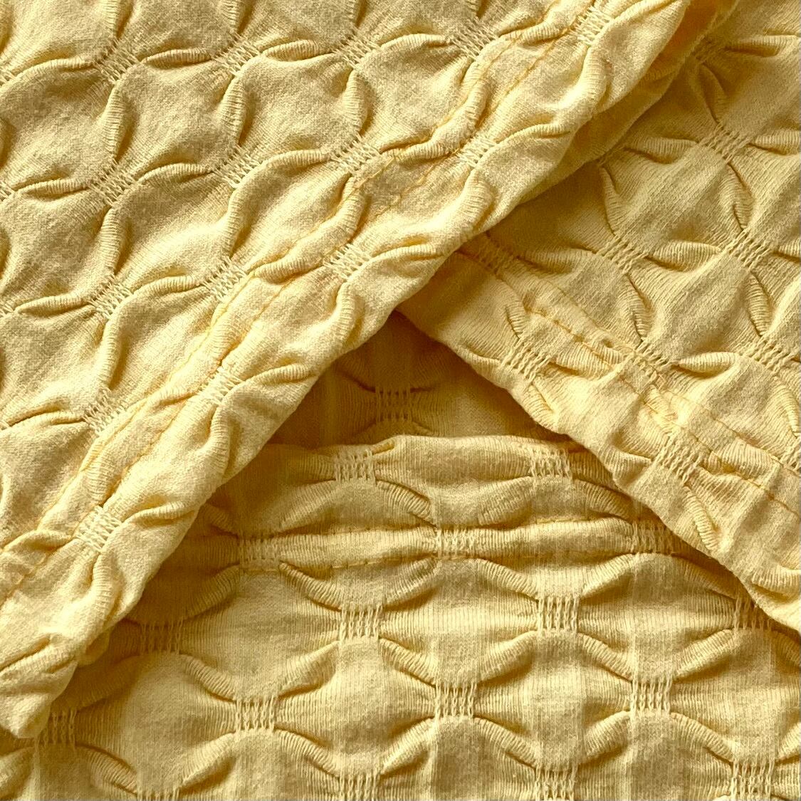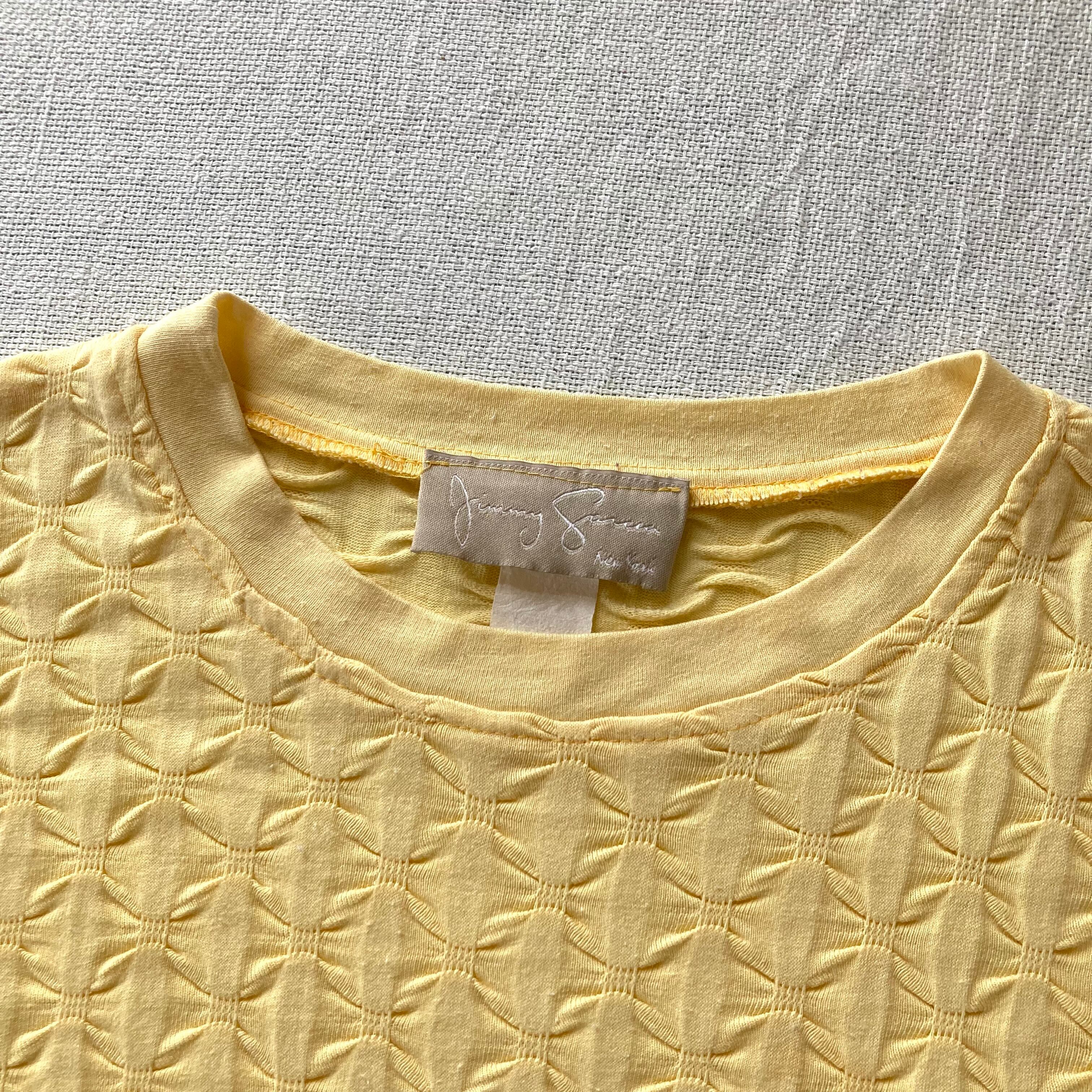 爽やかなライトイエロー生地に凹凸のケーブルデザインが施されたカットソーになります。サイジングにも程よくゆとりがあり、裾を入れても出しても、レイヤードスタイルでも重宝してくれる1着になるかと思います。
