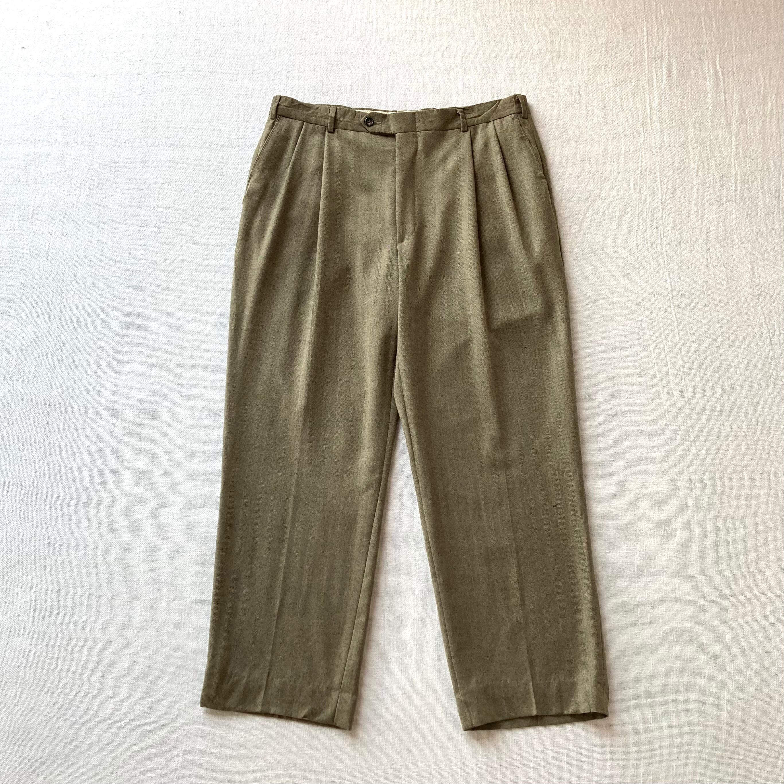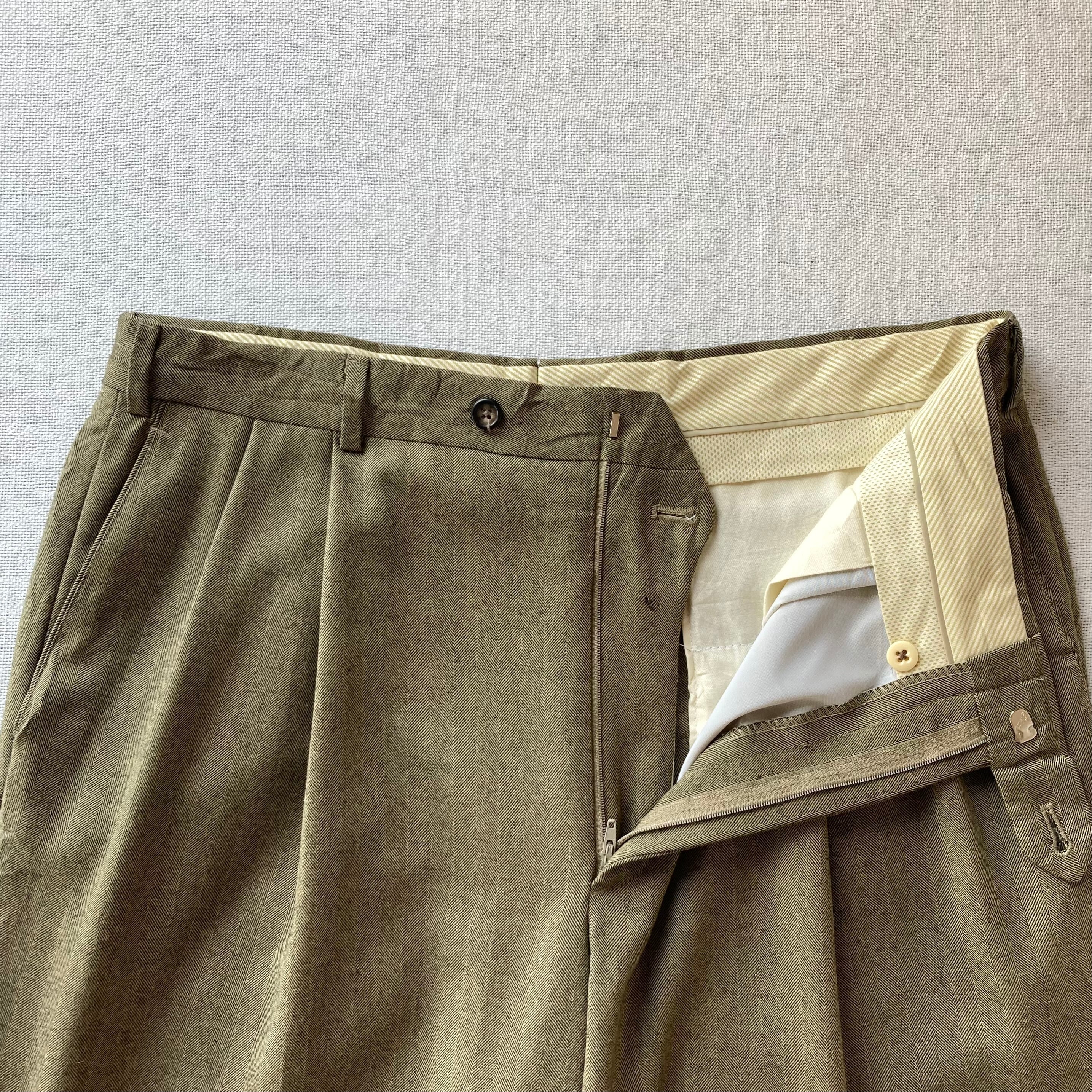 80s〜90s USA製 BERLEのwool slacksになります。落ち着いたカーキカラーのウールヘリンボーン地、深めの2タック、太いサイジングと程よい丈感が特徴的な一本です。