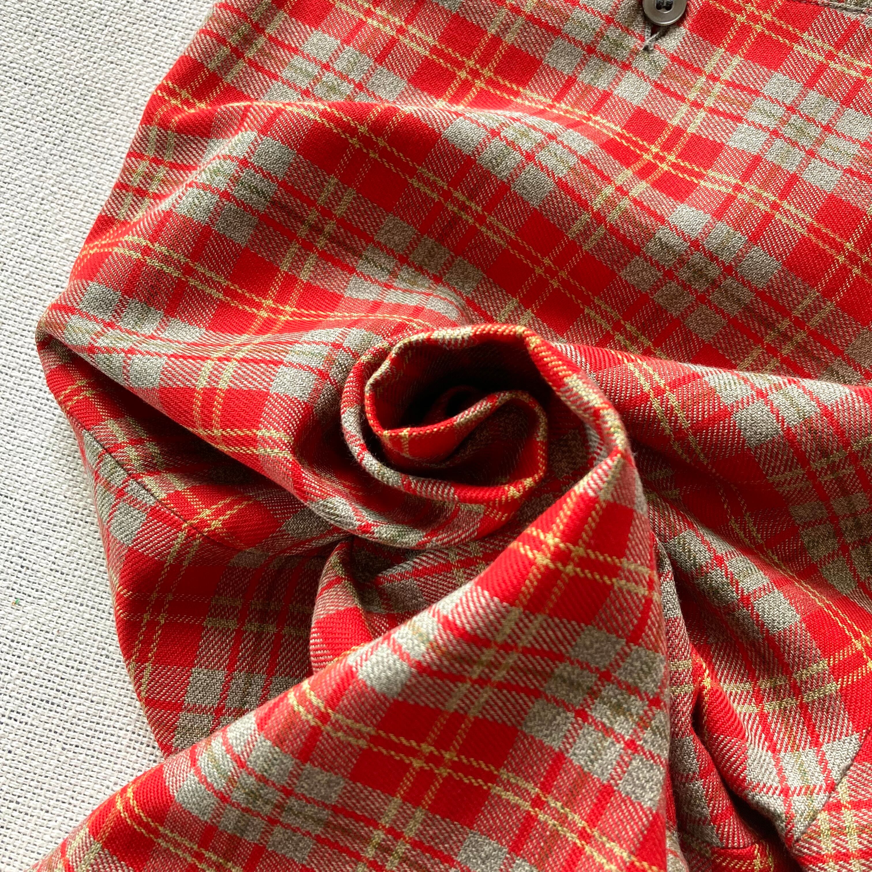 レッド・グレーのカラーリングに短丈のブーツカットシルエットが特徴的です。生地感は薄手で柔らかく通年で穿いて頂けるかと思います。