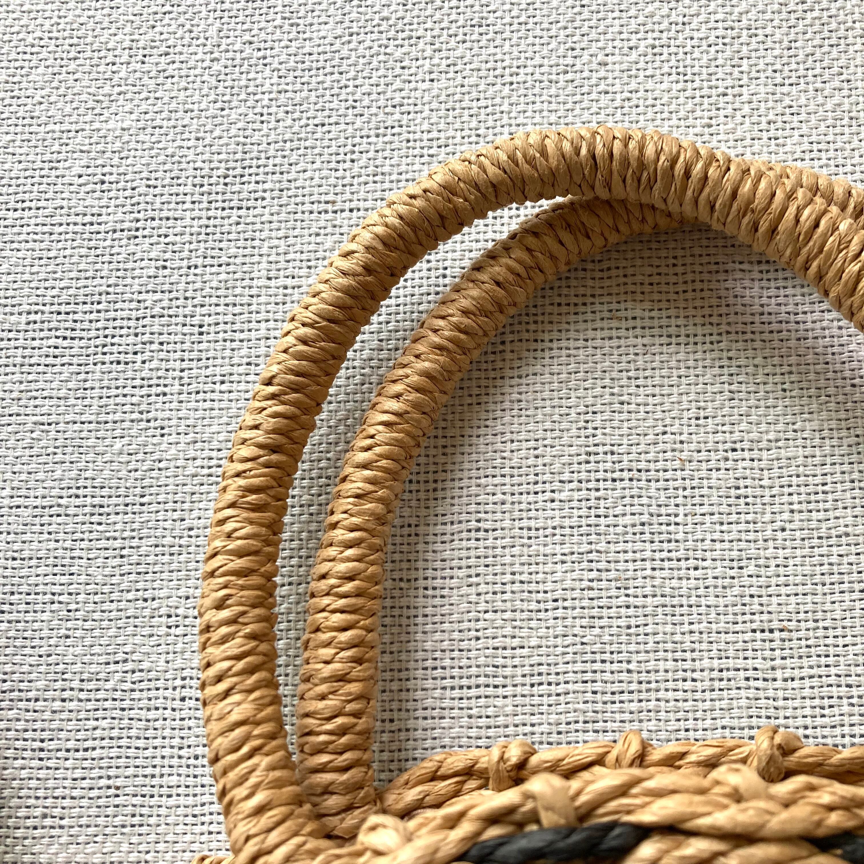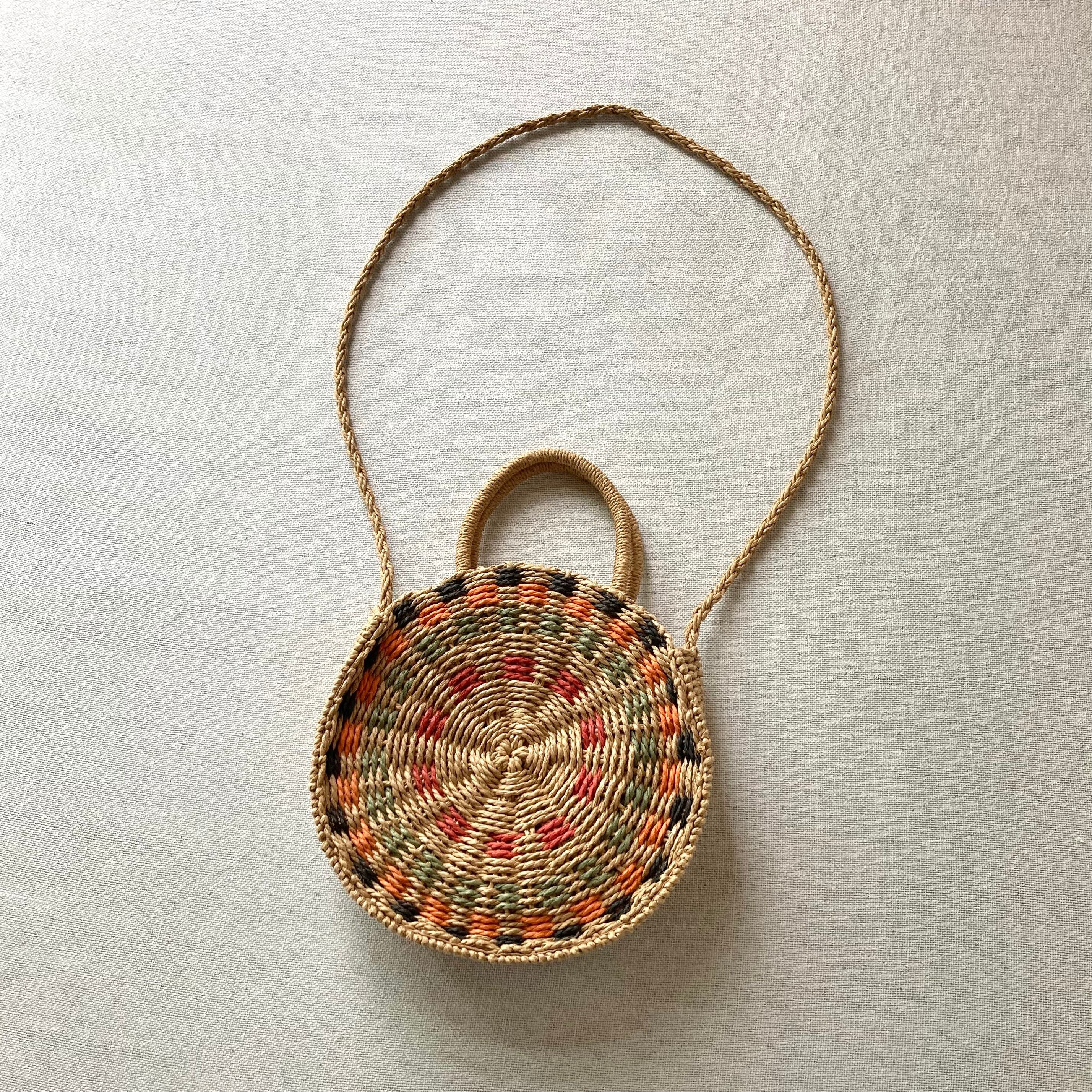 サークル状のストローショルダーバッグになります。レッド・グリーン系のカラーリングが可愛らしいと思います。6.5㎝ほど厚みがあり、容量的にも普段使いしやすいかと思います。