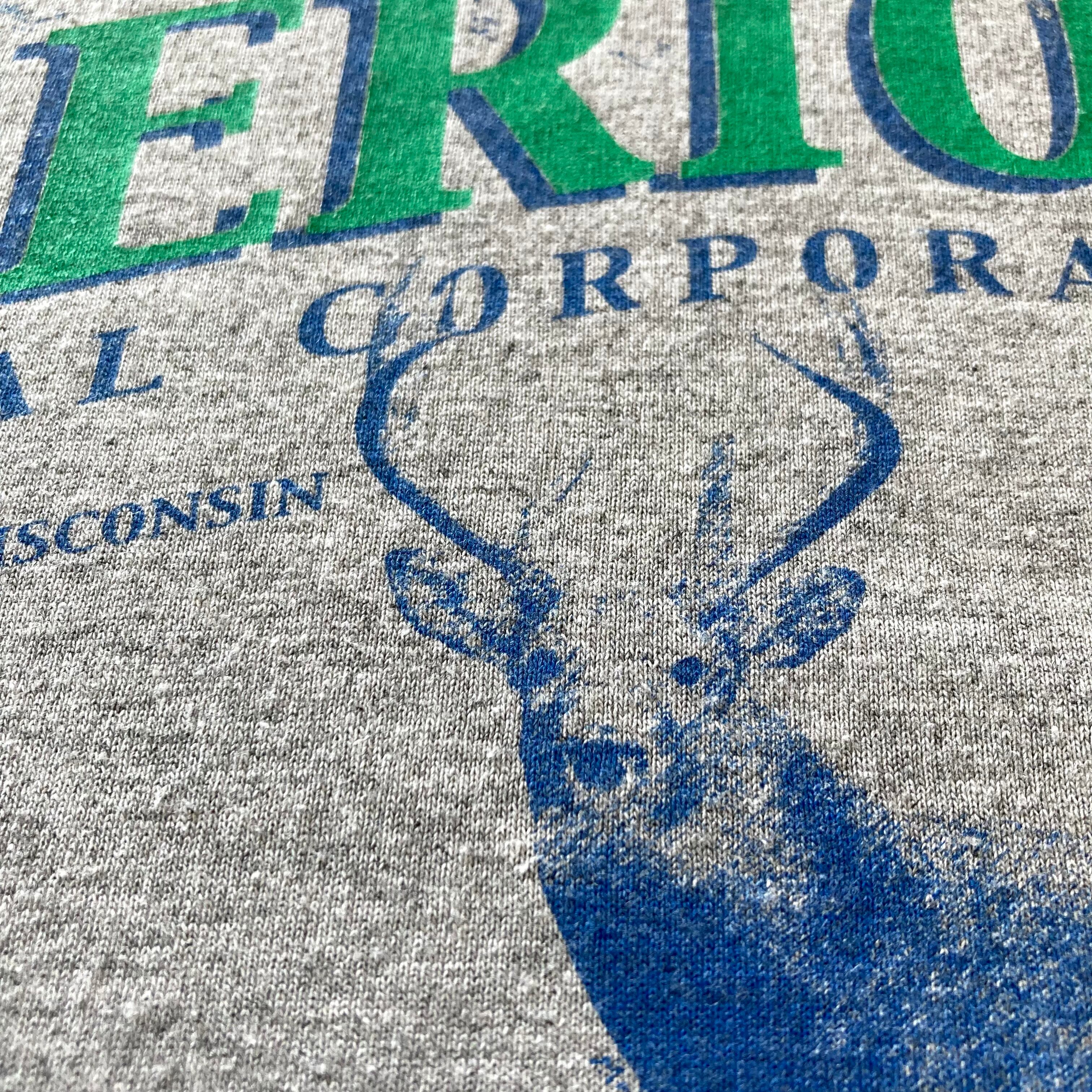 化学製品会社のロゴデザインがプリントされたteeになります。やや毛羽立った古着らしい雰囲気のグレー生地、何かを訴えかけてくるような動物たちの姿が印象的です。