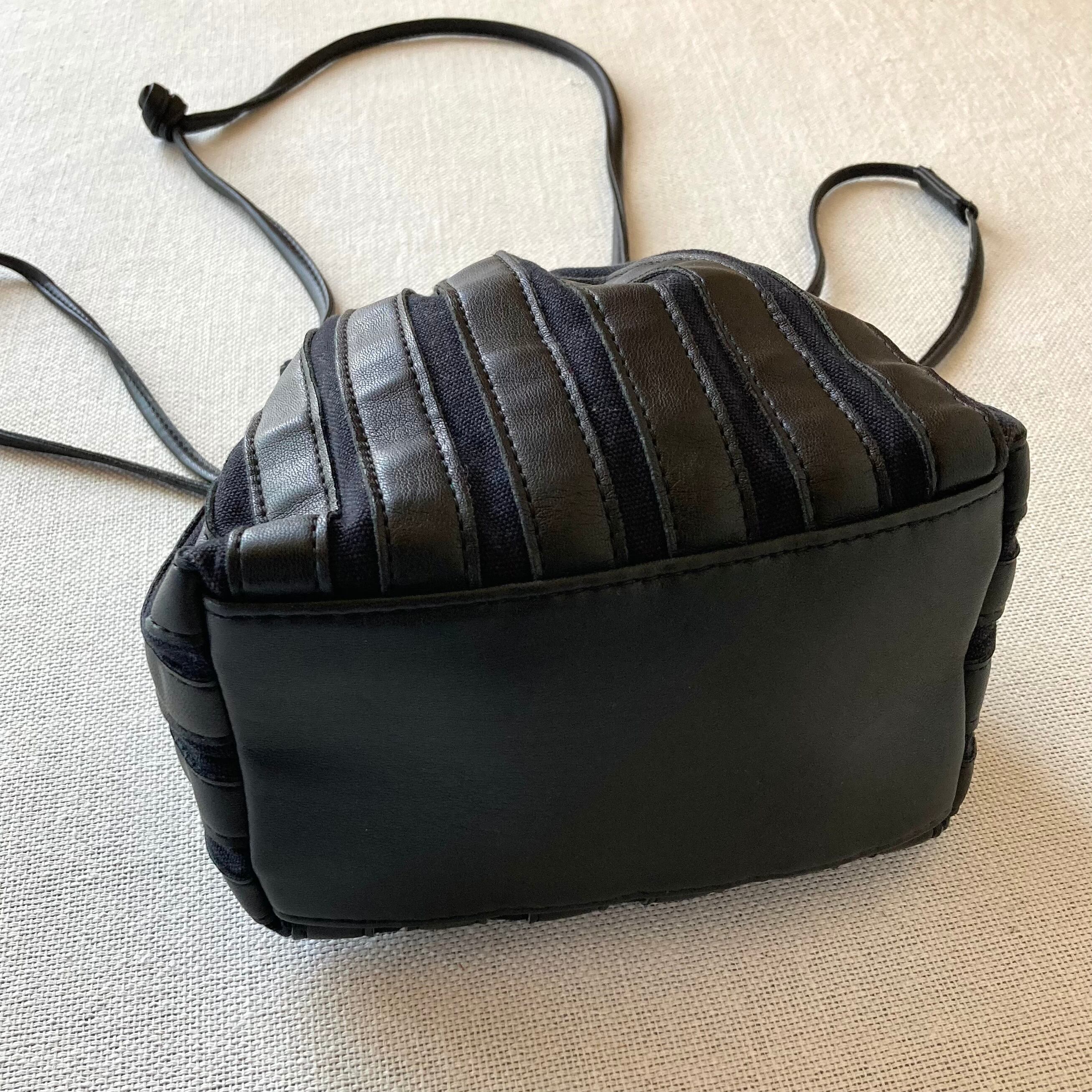 fake leatherとcottonがストライプ状にデザインされた 巾着 になります。小物が複数入る丁度良い容量となっておりますので、ちょっとした外出や散歩、旅行時のサイドバッグ用になど、普段使いしやすい一品かと思います。