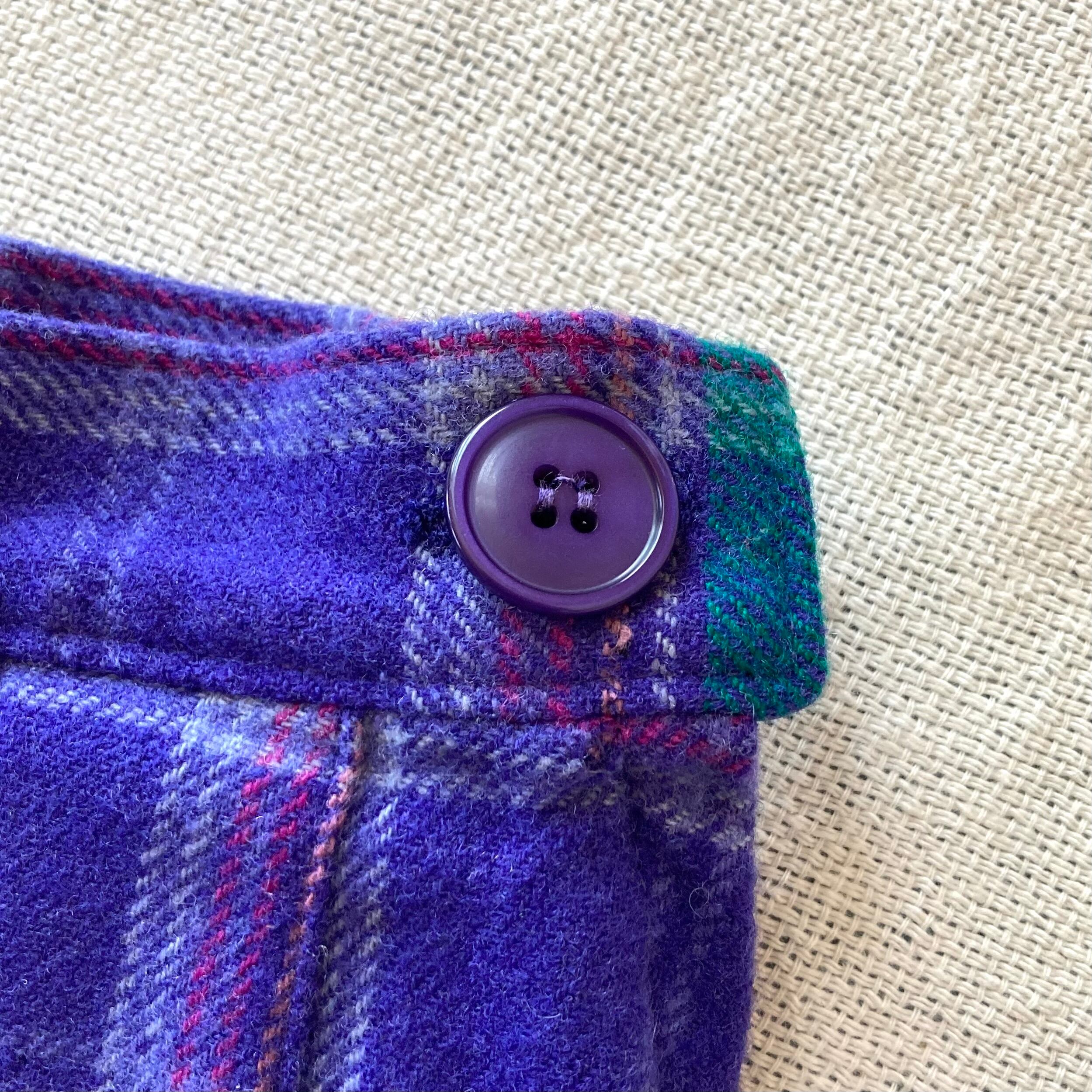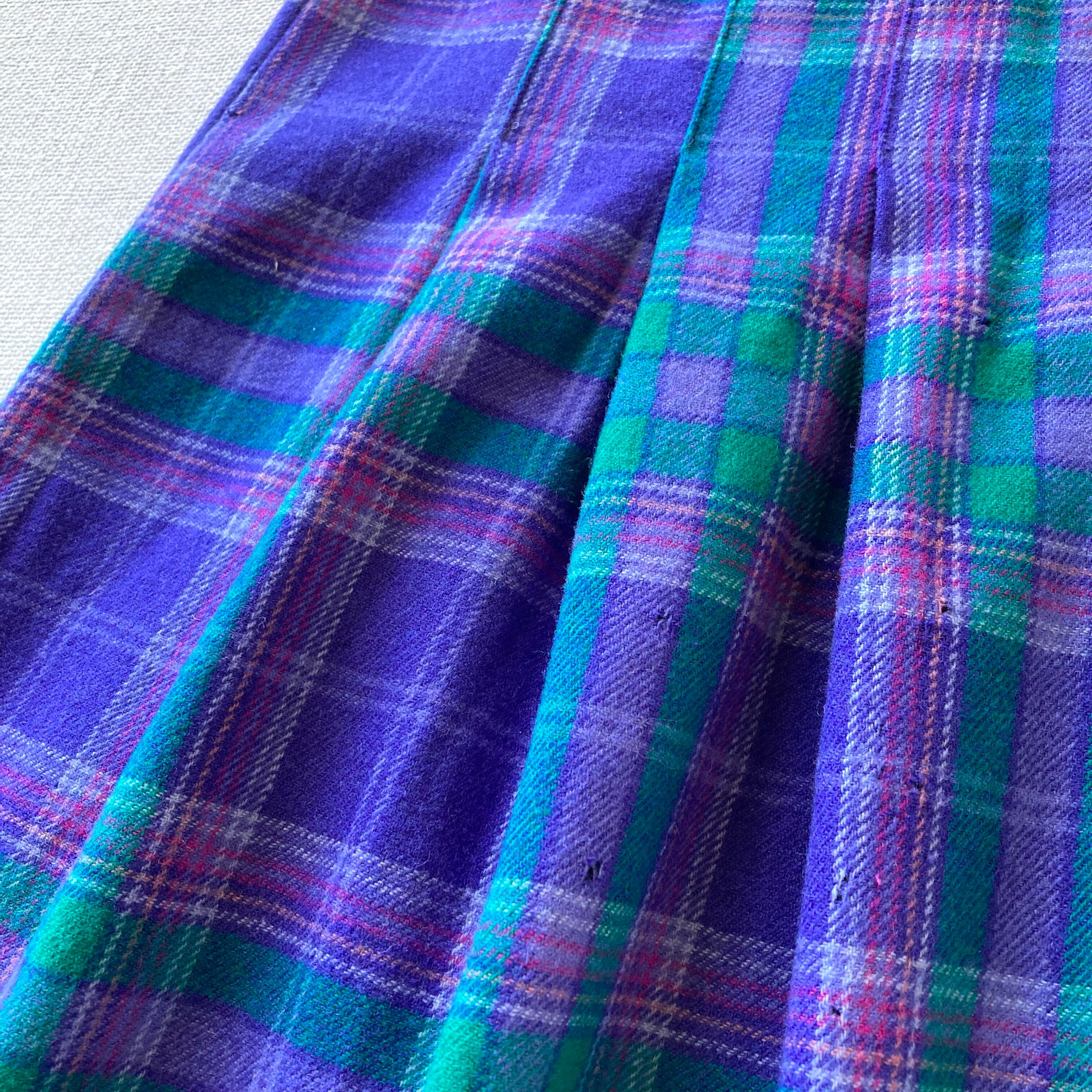 70s USA製 PENDLETONのplaid wool skirtになります。パープル・グリーン系の可愛らしいチェックパターン、起毛したwoolの生地感が特徴的な一本です。レイヤードの際などに雰囲気良い差し色となってくれそうです。