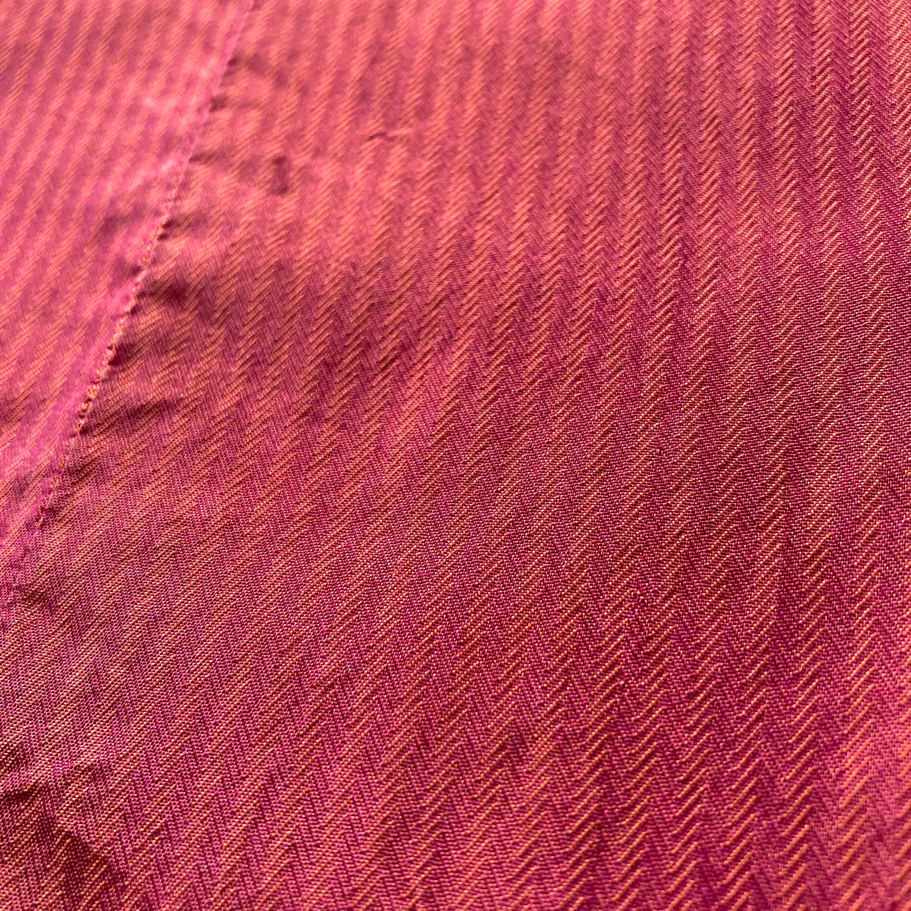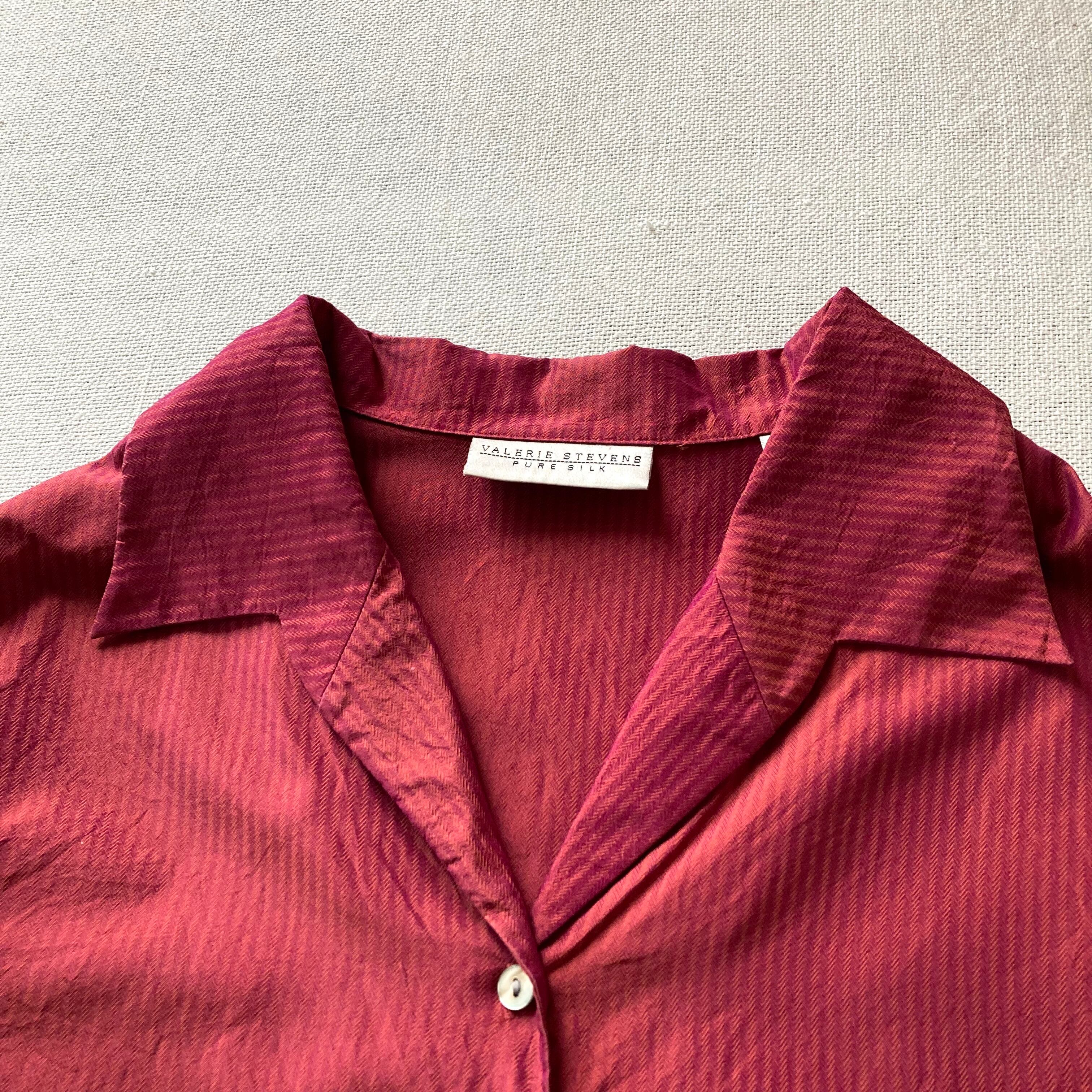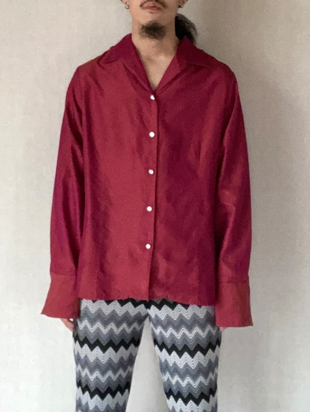 90s VALERIE STEVENSの silk shirtになります。シャープな雰囲気の開襟仕様、光沢のある薄手でシャカシャカとしたsilk生地、随所のシェルボタン、wine redの上品な色味が特徴的な1着です。
