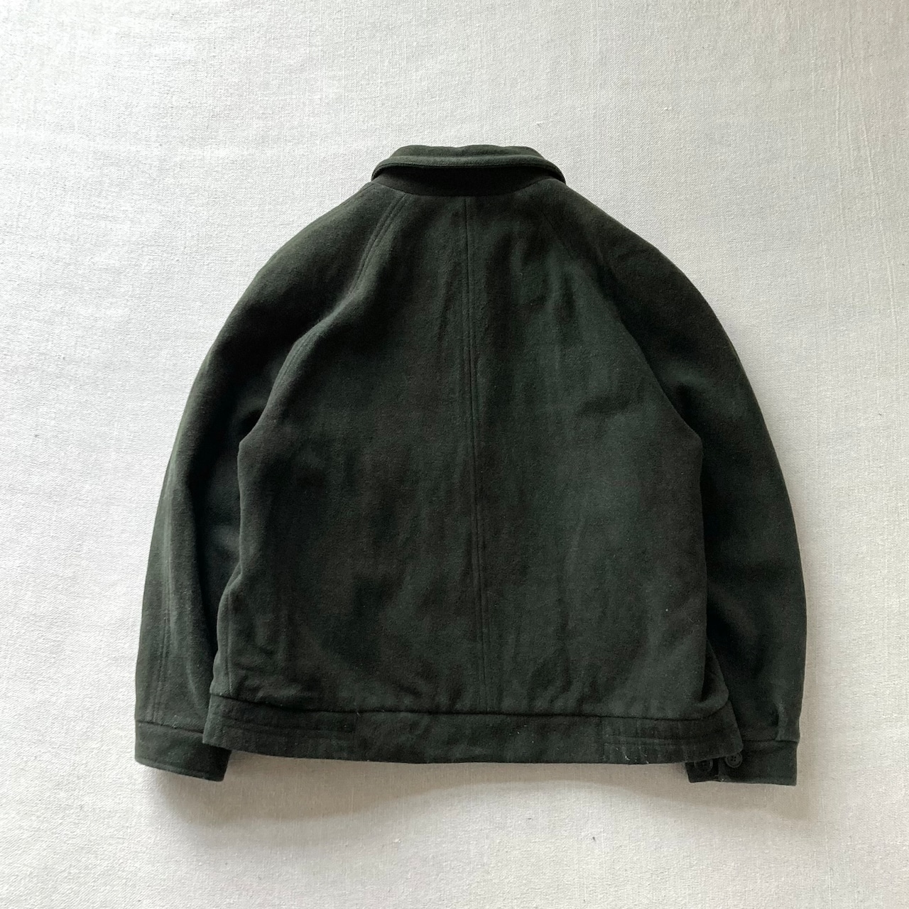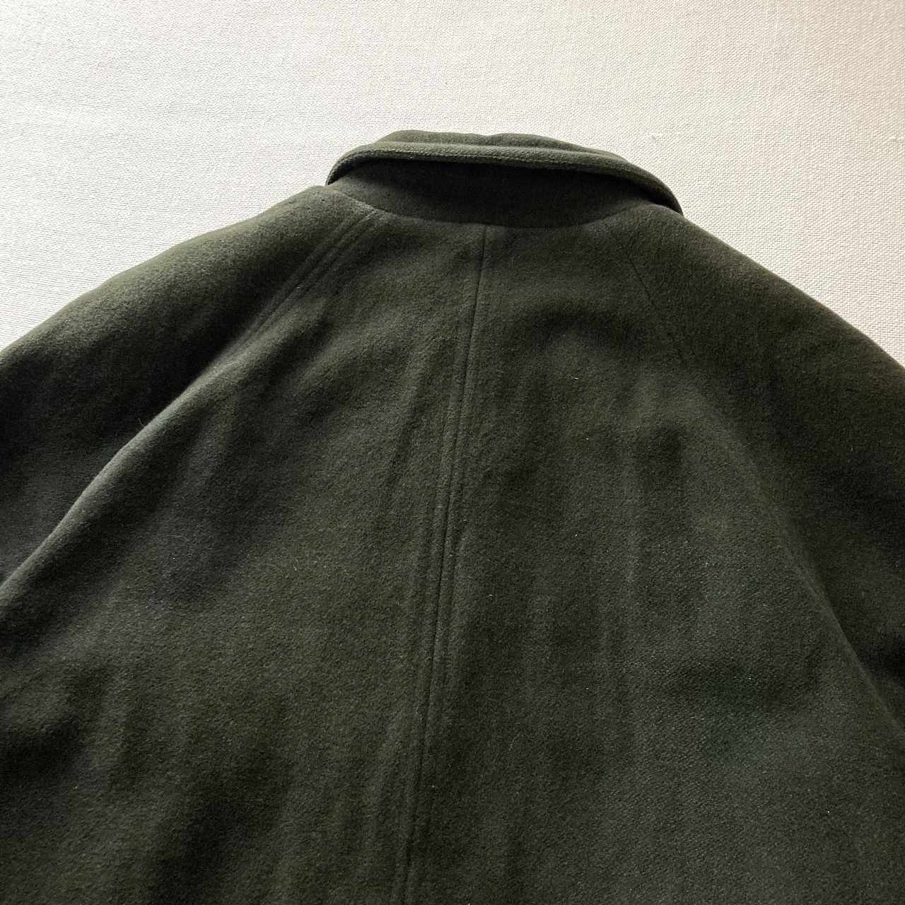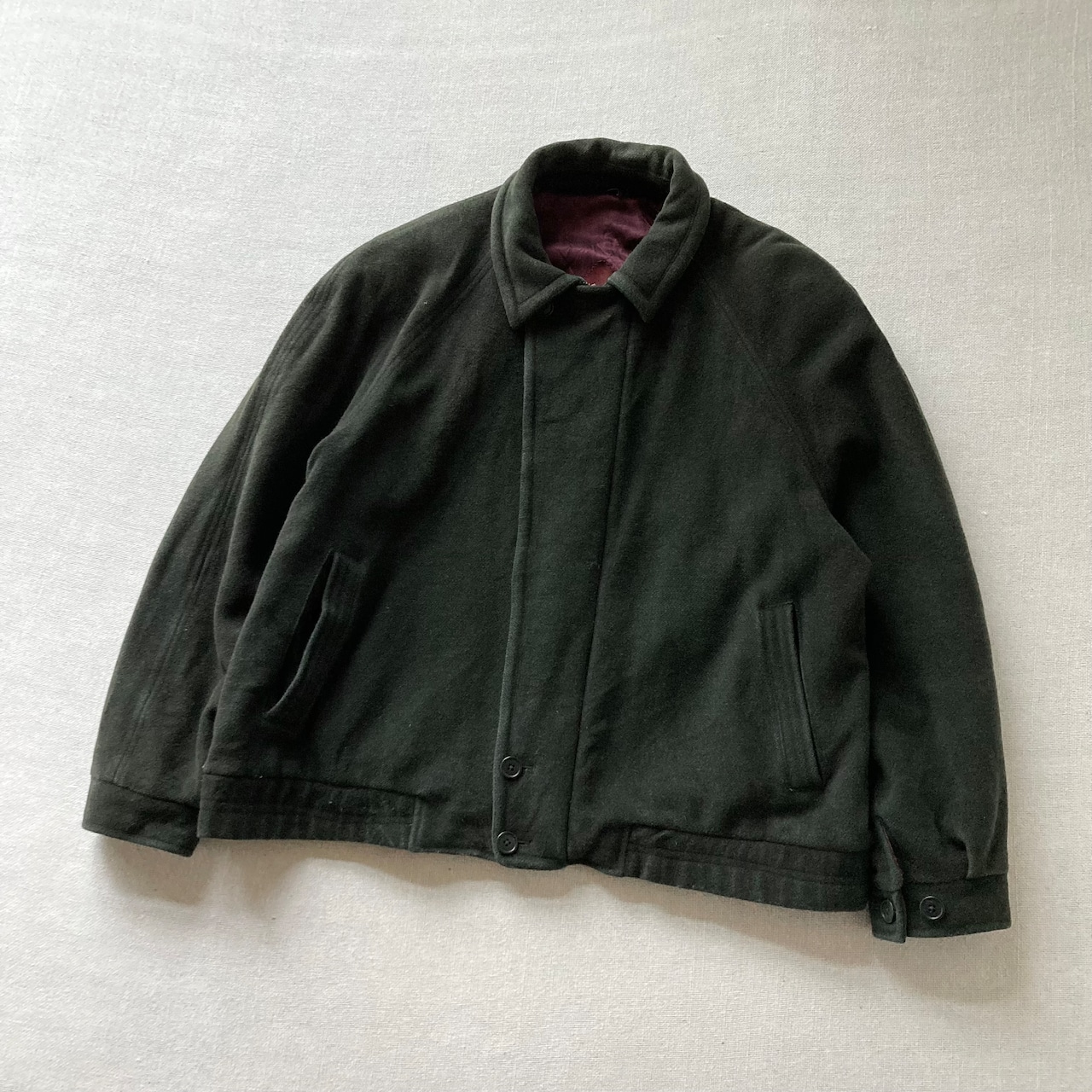 woolの柔らかく滑らかな質感、やや斜めにcutされた比翼デザイン、深緑の生地にボルドーの裏地が良いカラーリングの1着です。