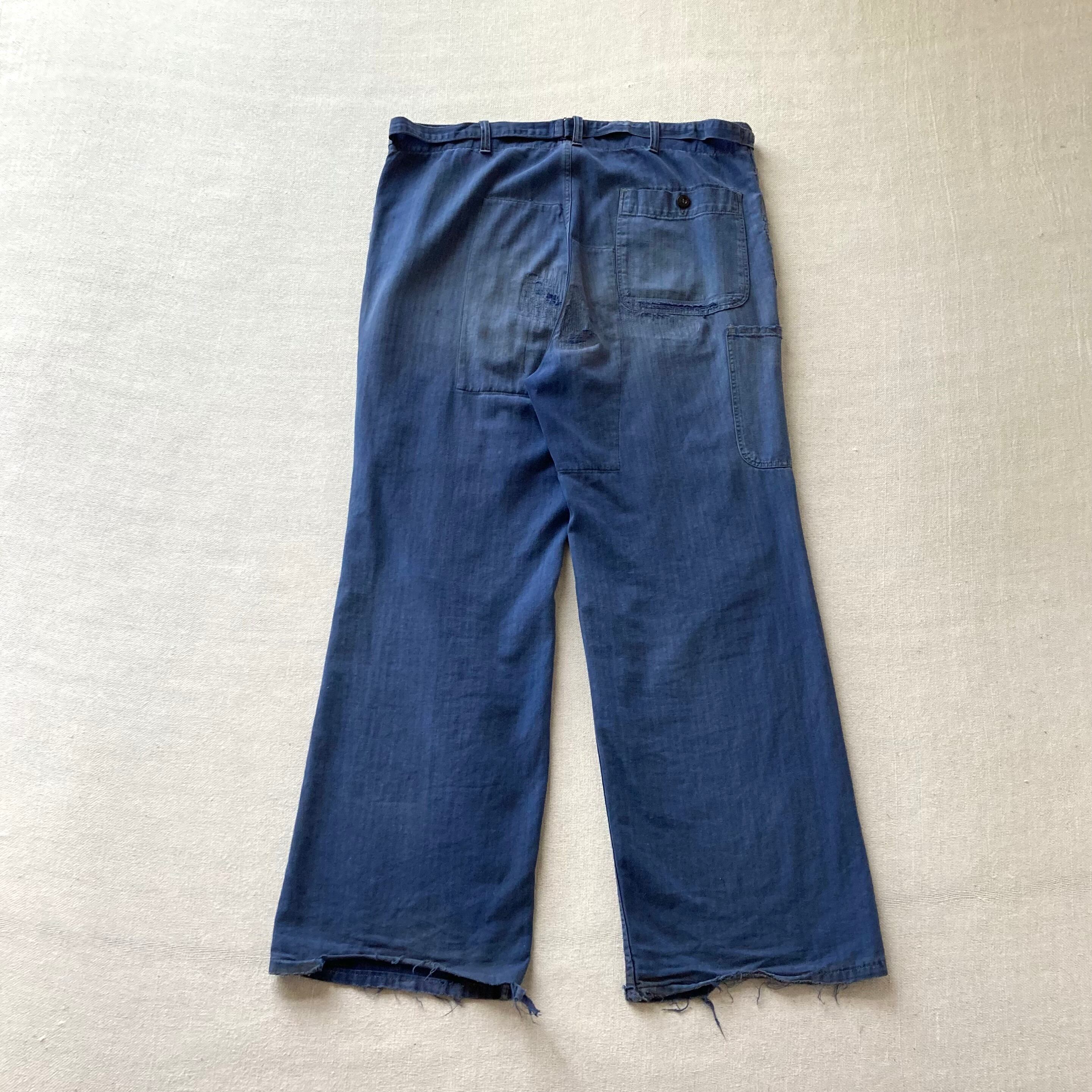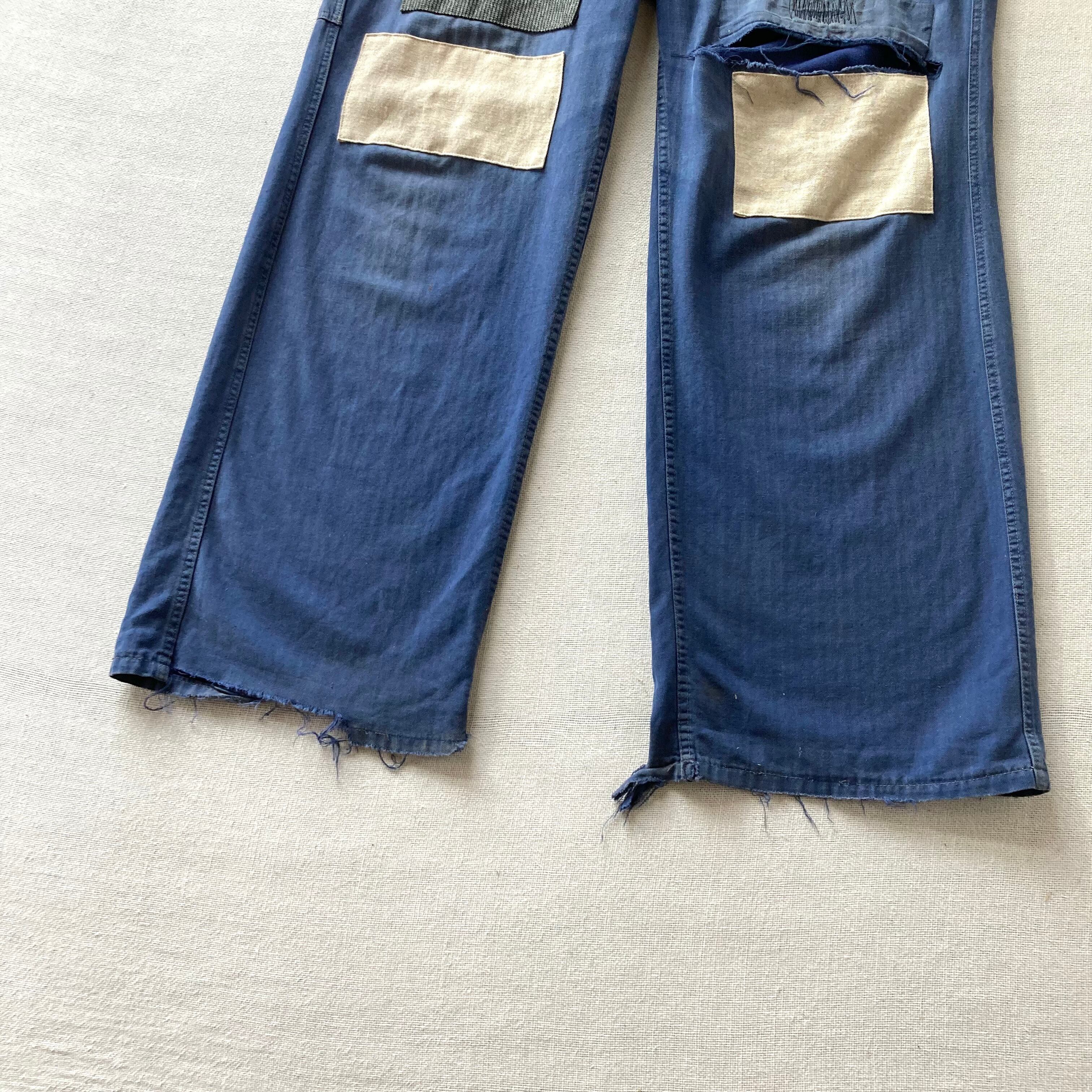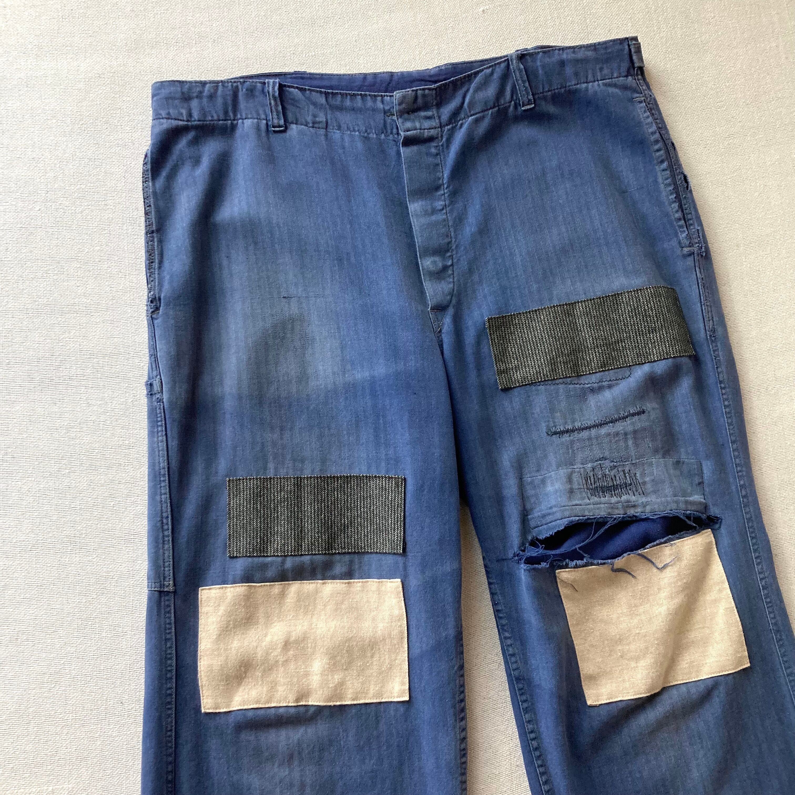 patchworkが施されたeuro work pantsになります。ややフレアがかった太いシルエットに加え、随所のダメージやヘリンボーンの生地感が抜群に雰囲気のある一本かと思います。